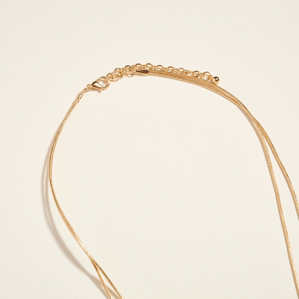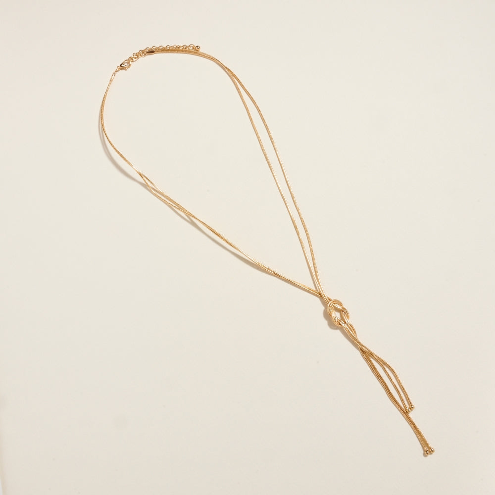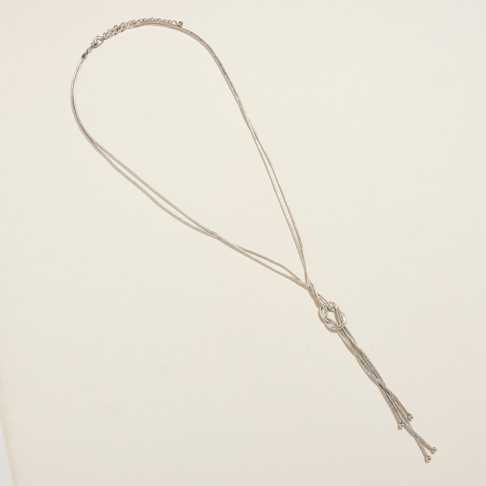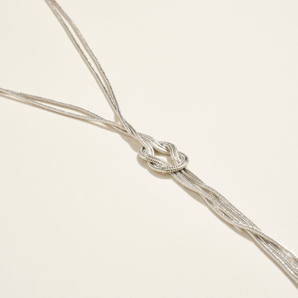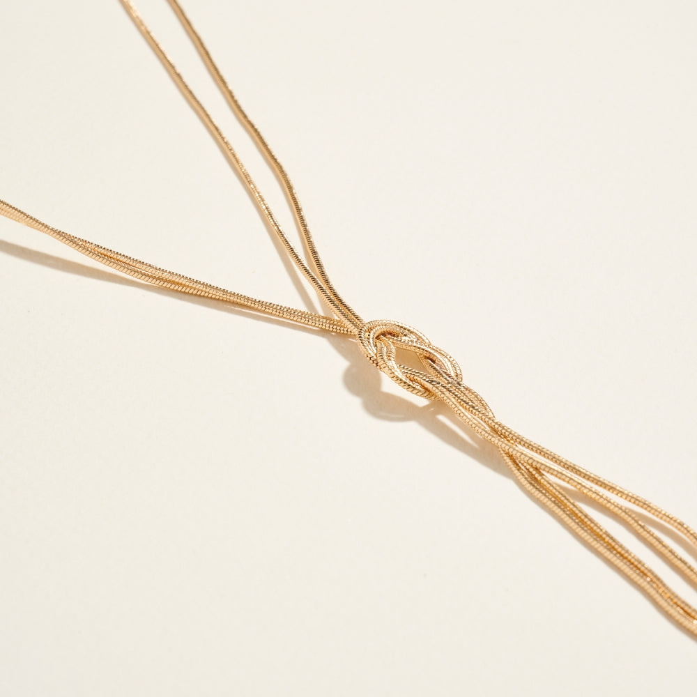 This necklace features a sleek snake rope chain with a knotted design for modern elegance. The 14 inch length makes it a versatile choker that pairs easily with longer chains.