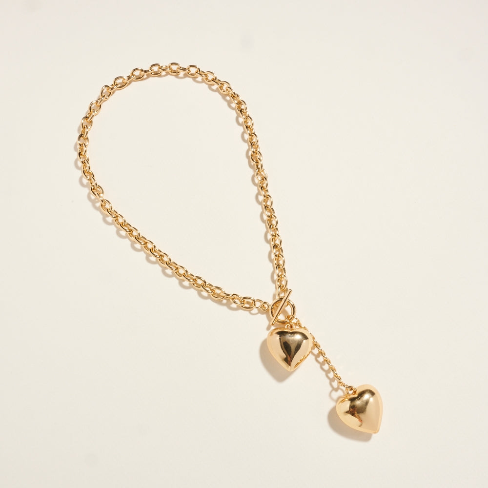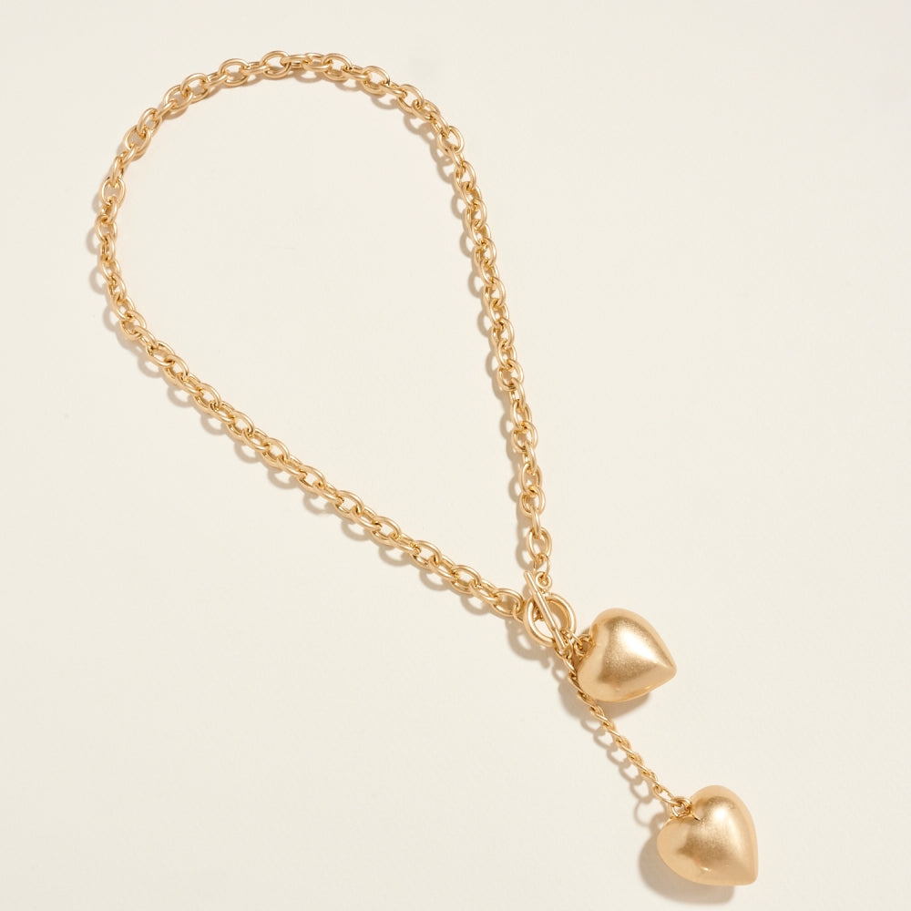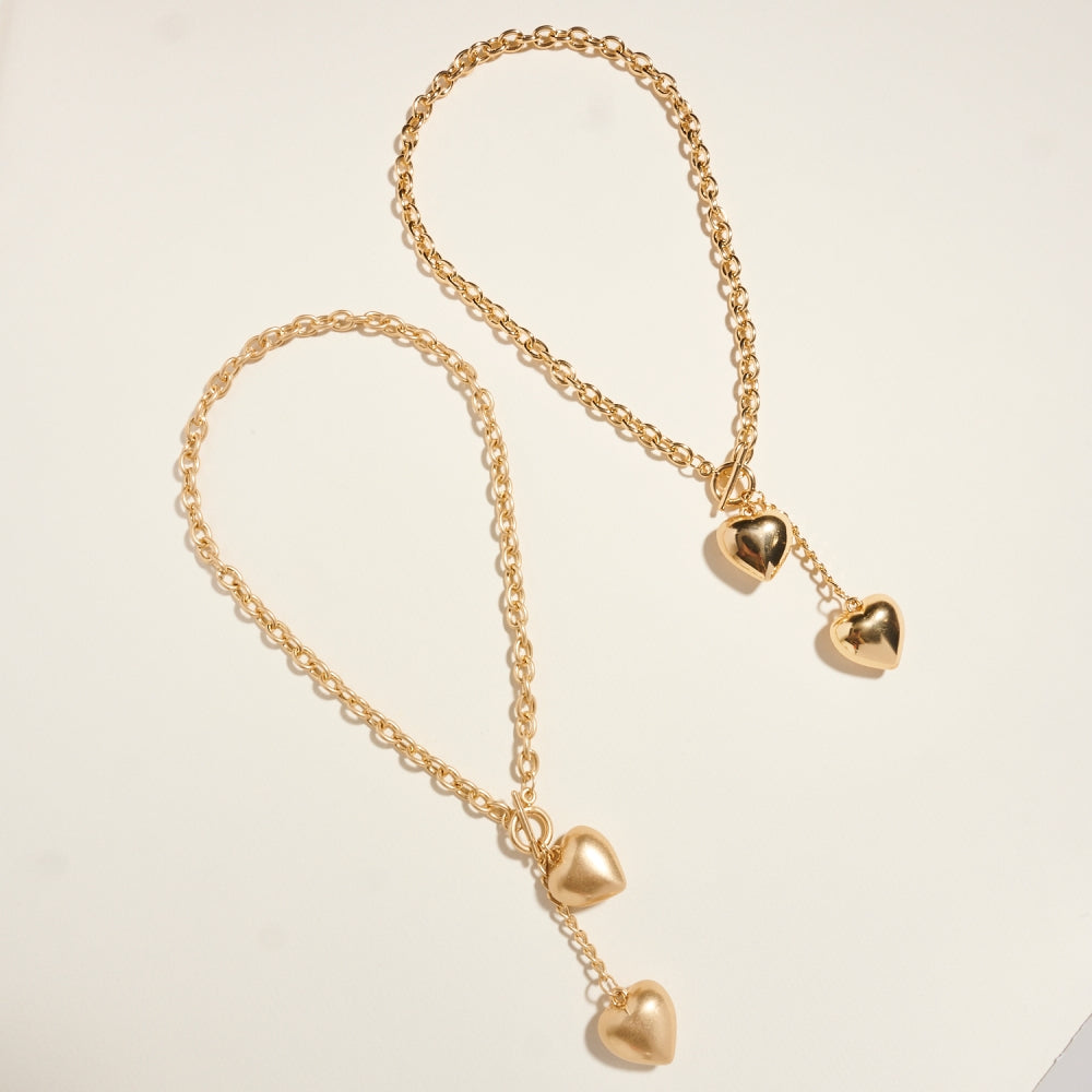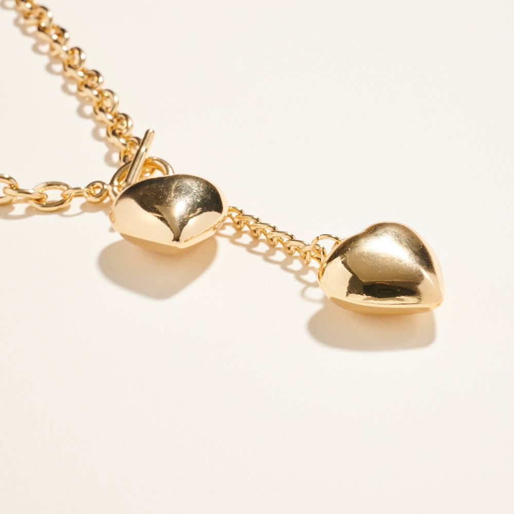 With its duo of puffy heart pendants, this necklace offers charm and modern style. The 16 inch length makes it versatile for both casual looks and special occasions.