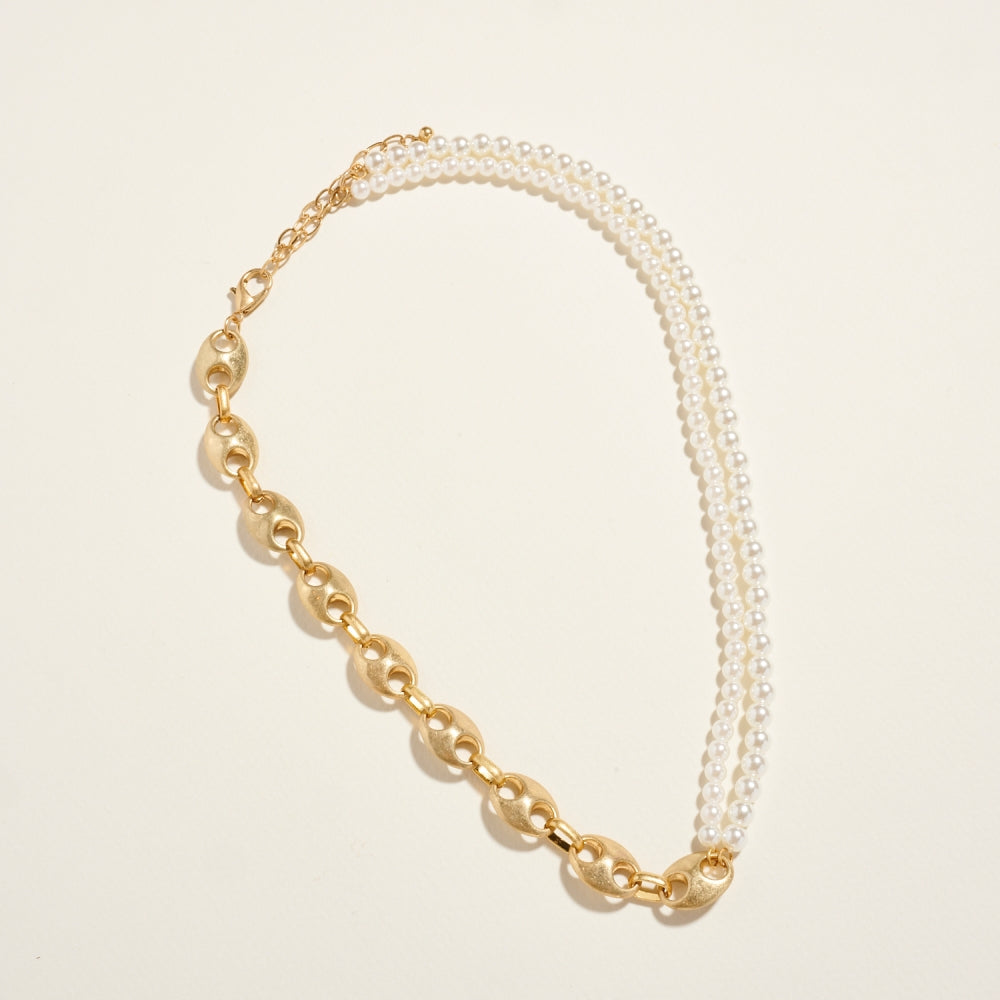 This necklace blends classic pearls with bold chain links for a striking contrast. The 17 inch length makes it a standout accessory for layering or solo wear.