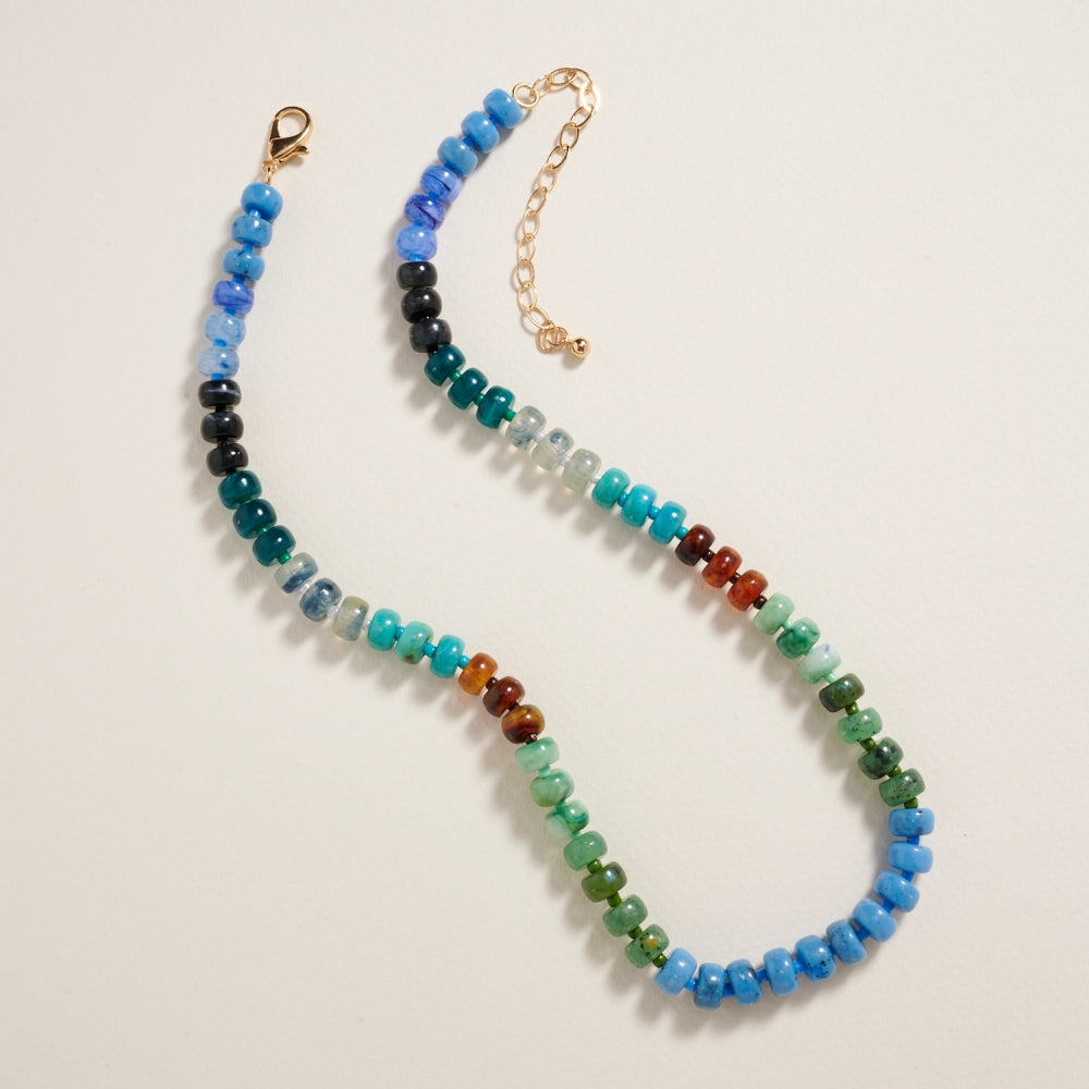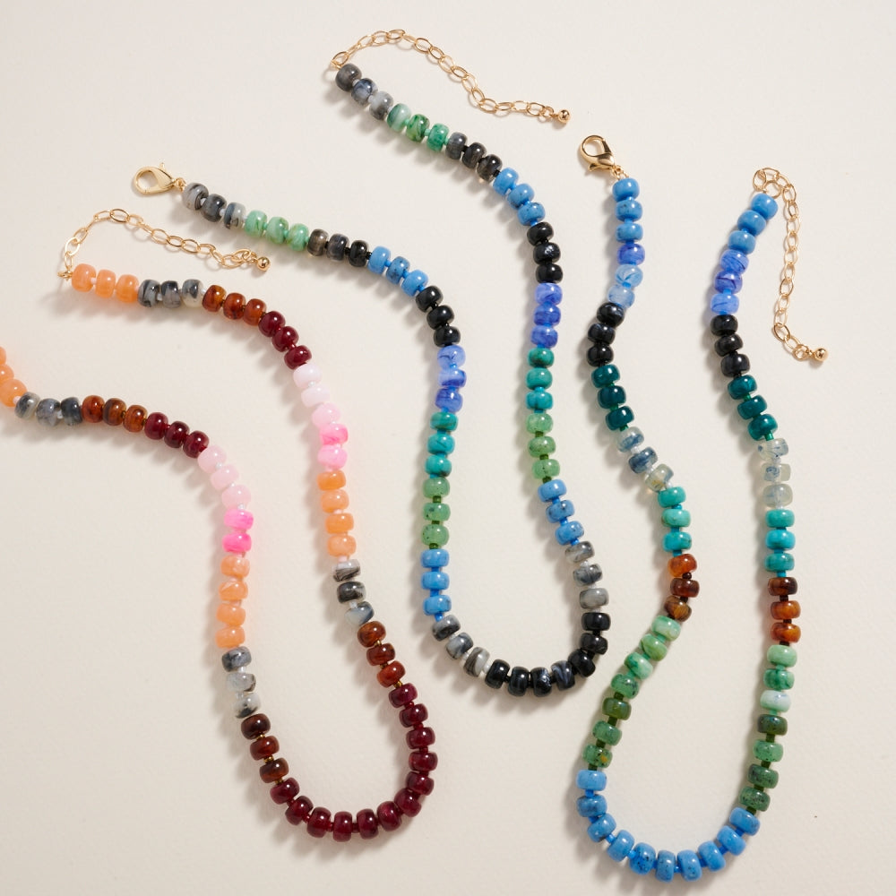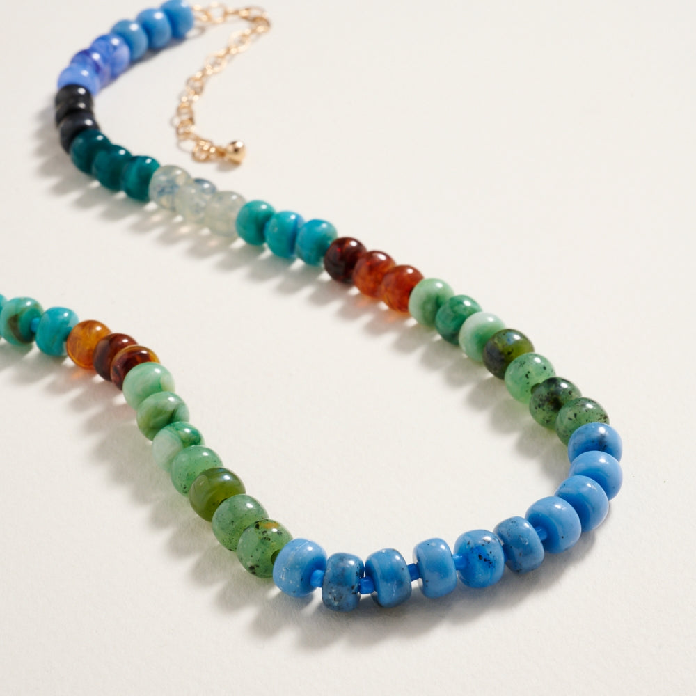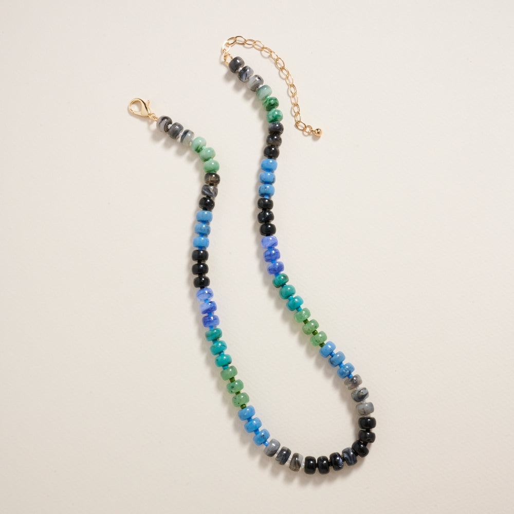 Featuring polished rounded beads in a natural ombre pattern, this 17 inch necklace blends organic textures with smooth color transitions.