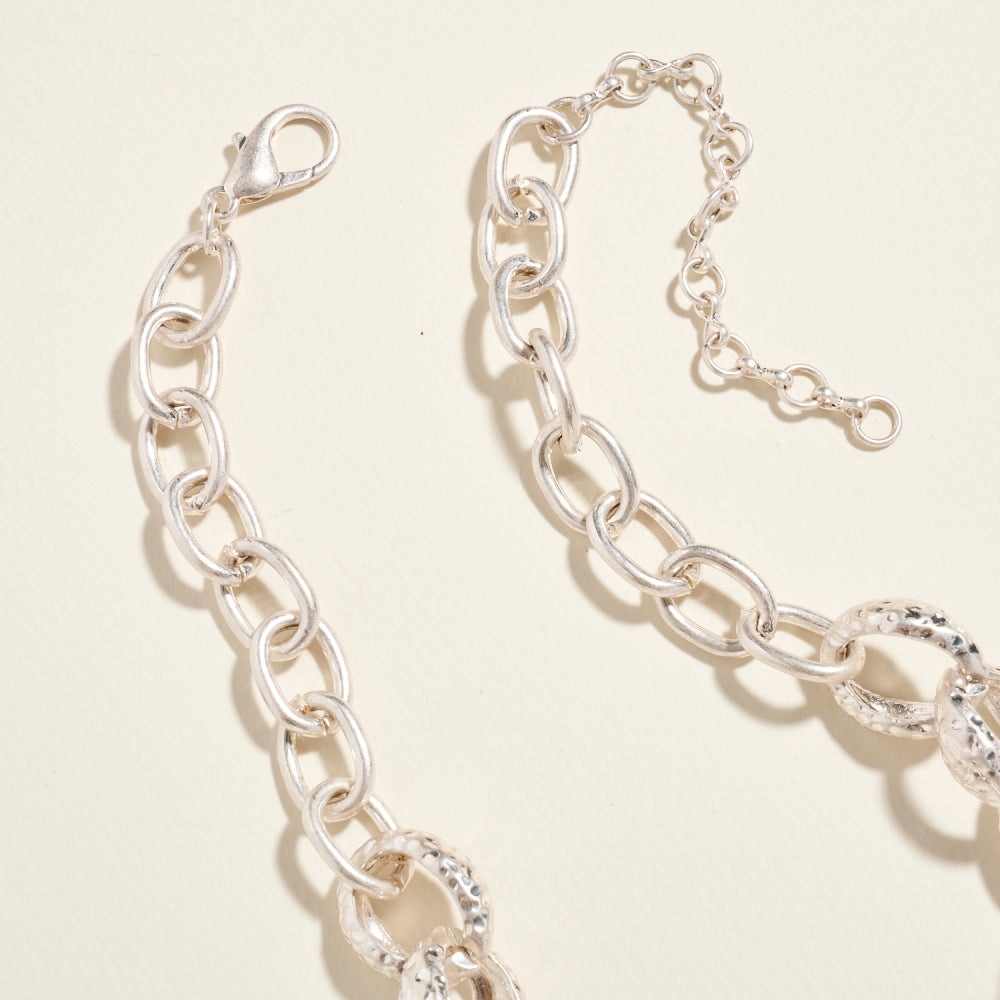 This necklace features hammered rolo links that add texture and shine to a classic chain style. At 18 inches, it offers a comfortable fit that layers beautifully or stands out alone.