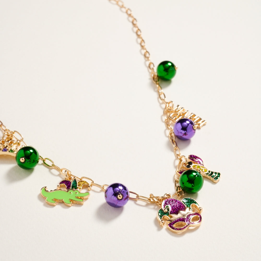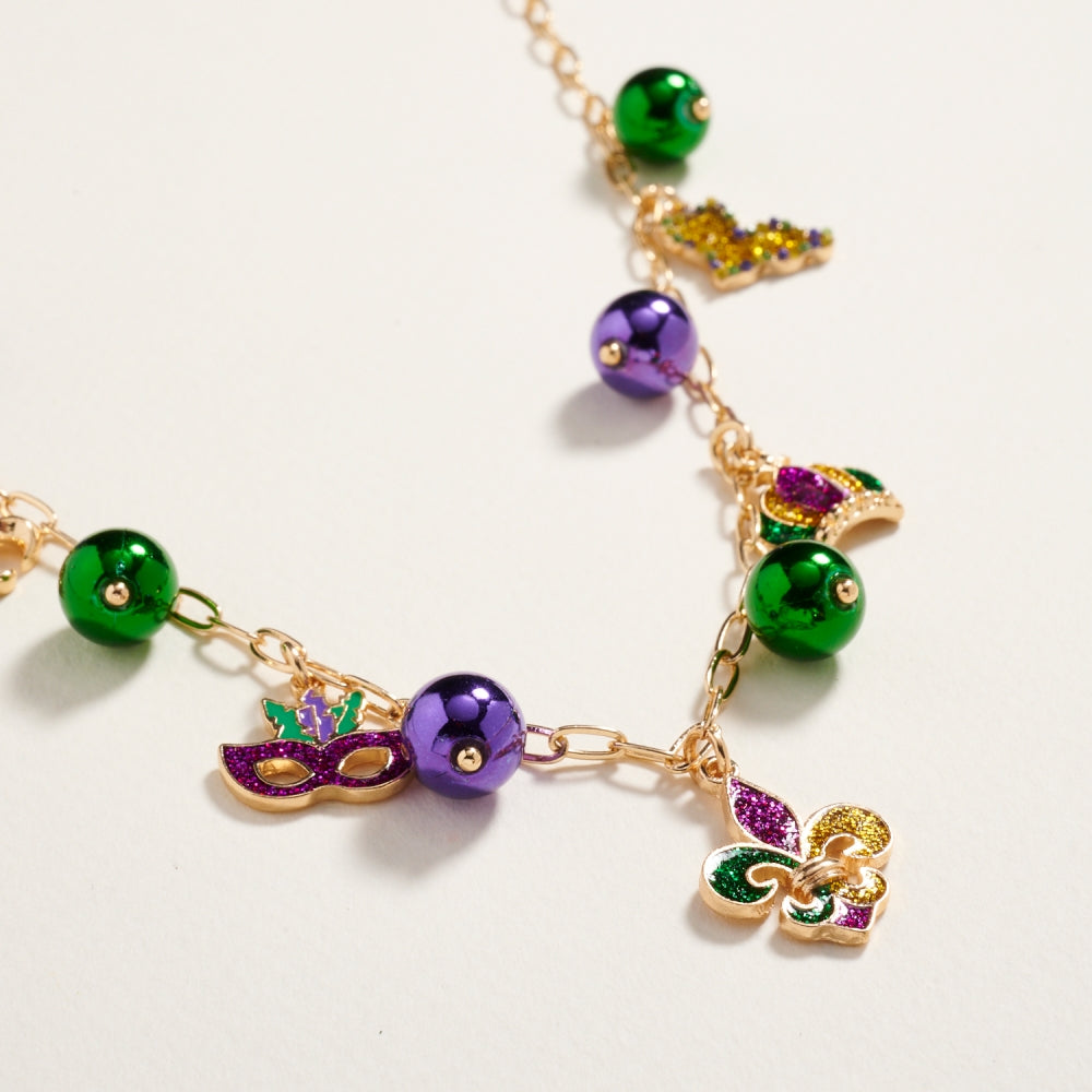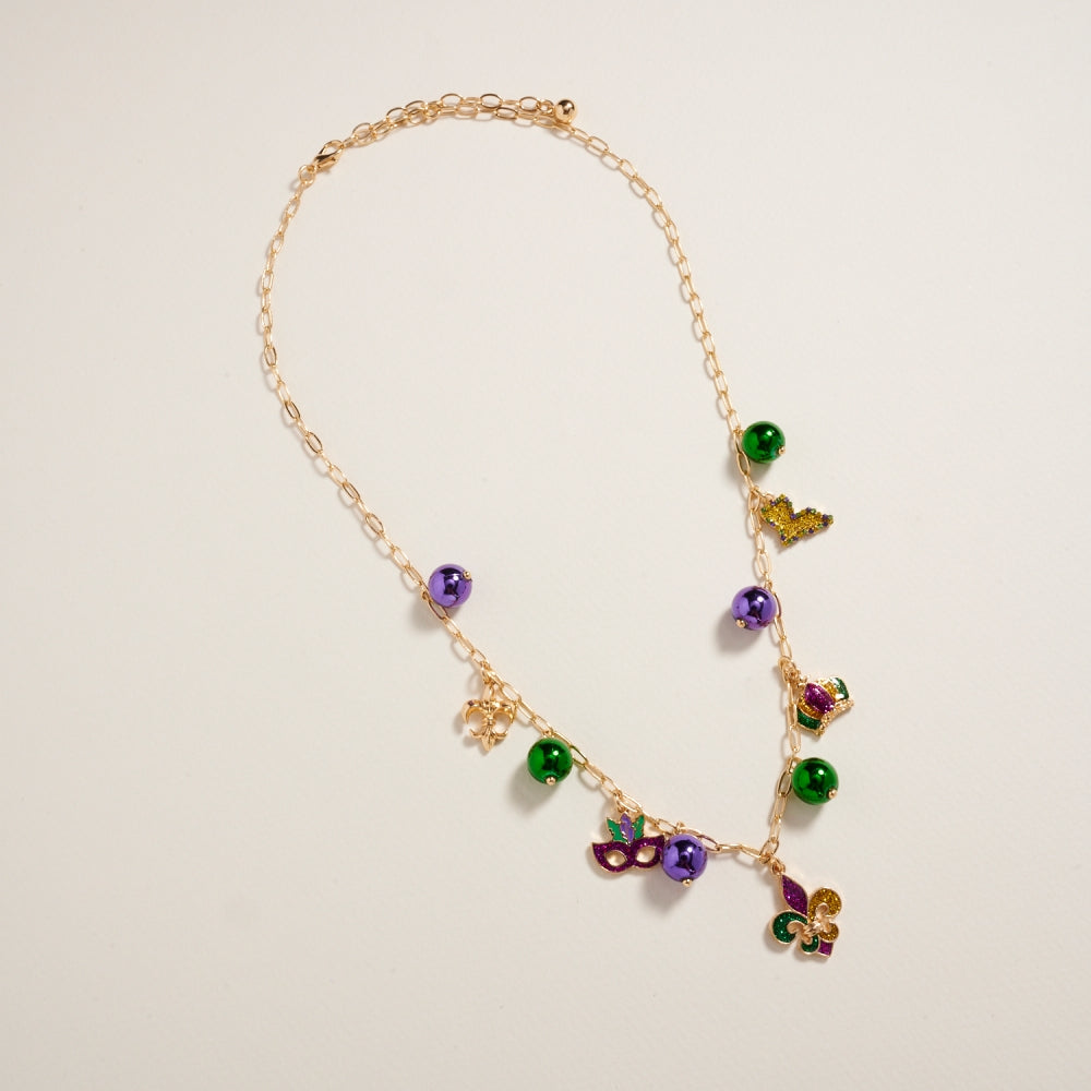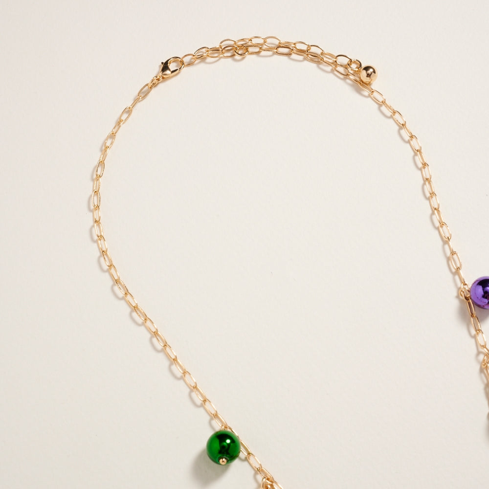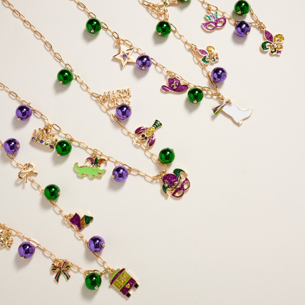 Celebrate Mardi Gras in style with this lightweight 18-inch bead chain necklace. Adorned with mixed beads and whimsical charms in iconic carnival colors, it’s an easy way to bring a pop of festive energy to any outfit.