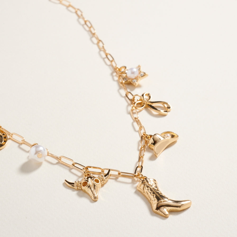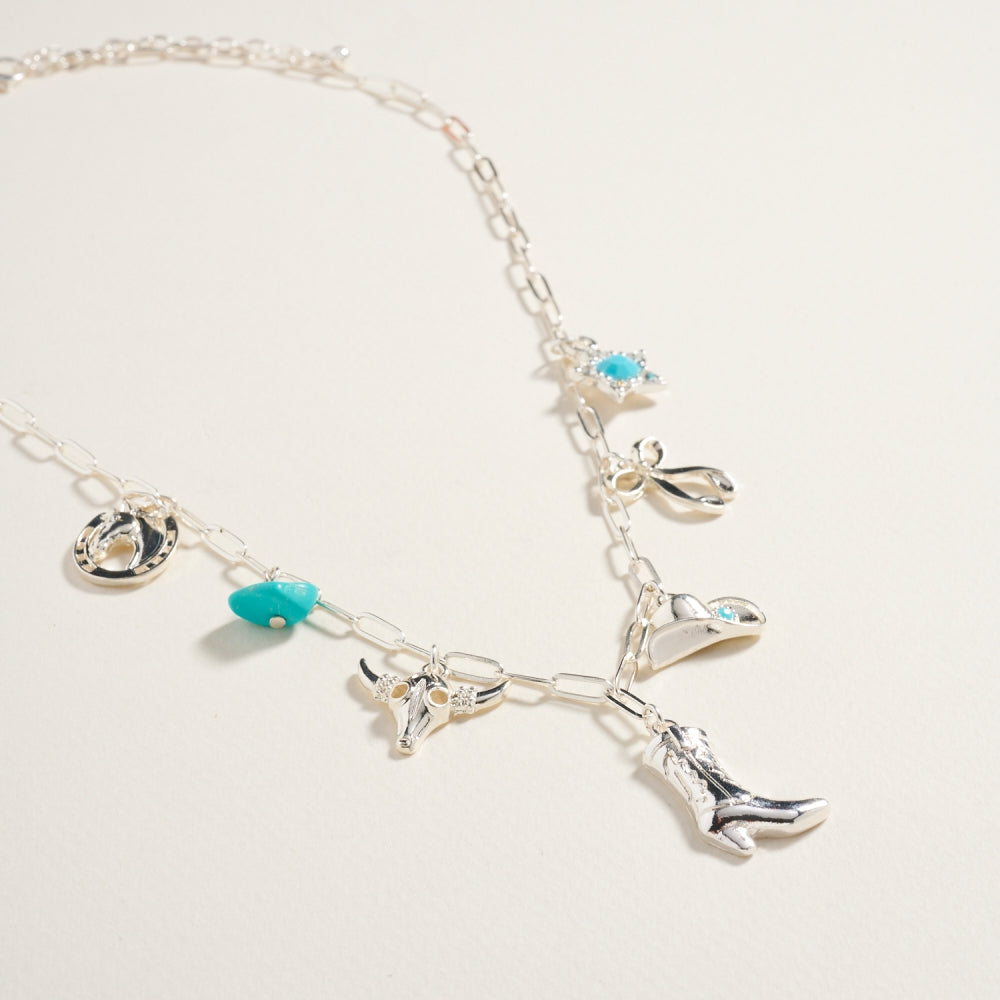 This necklace blends rustic charm with trendy style, showcasing multiple Western pendants on an 18-inch chain. Perfect for layering or wearing solo.