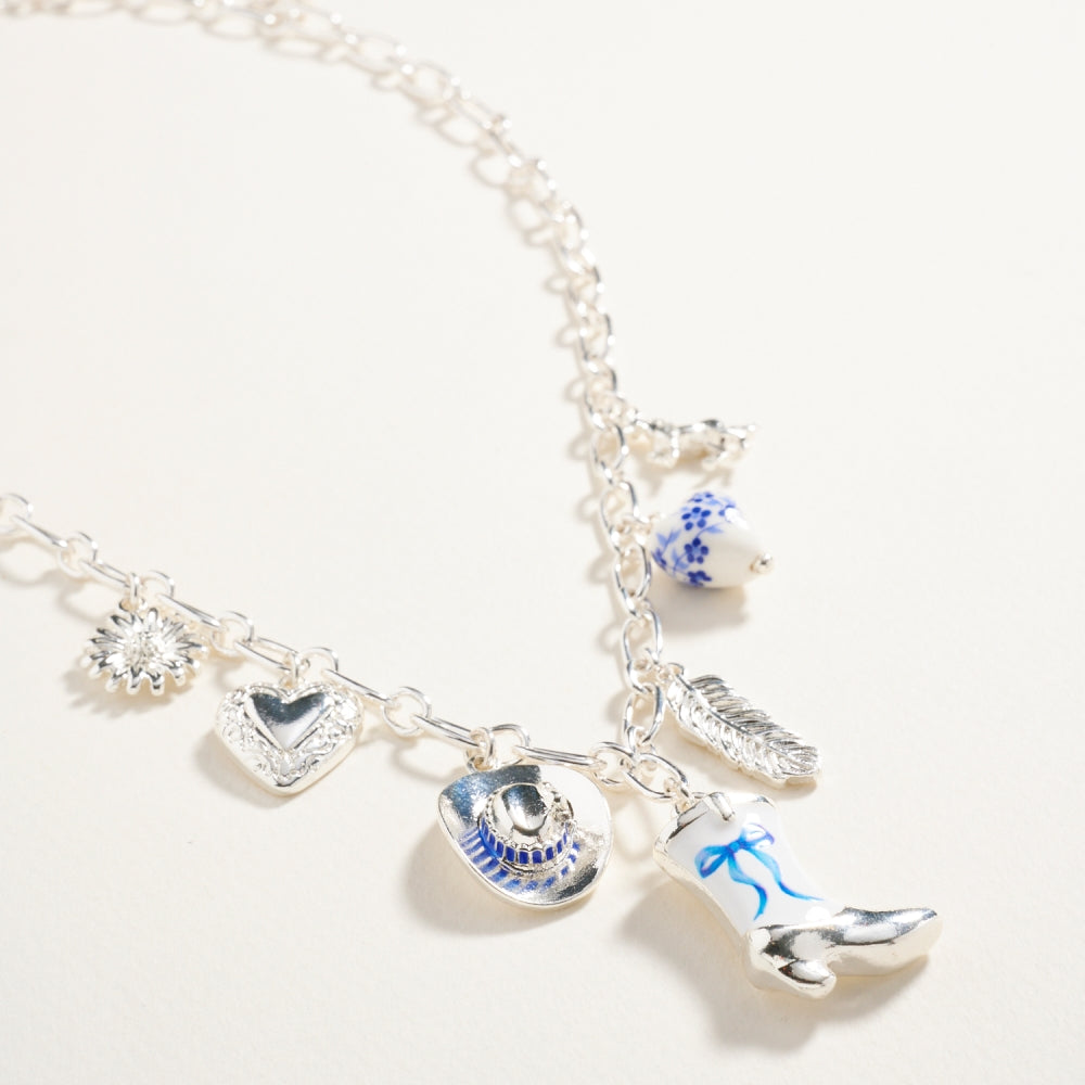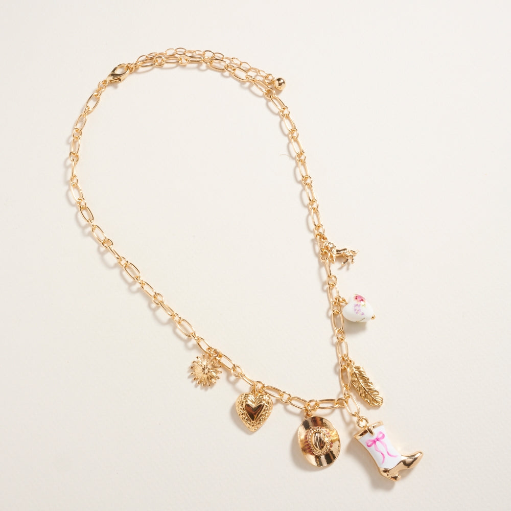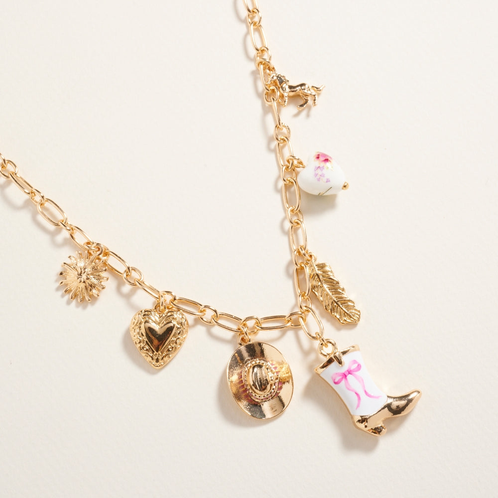 Bring country elegance to your jewelry collection with this chain necklace crafted with floral beads and Western charm pendants. Perfect for casual wear or special events.