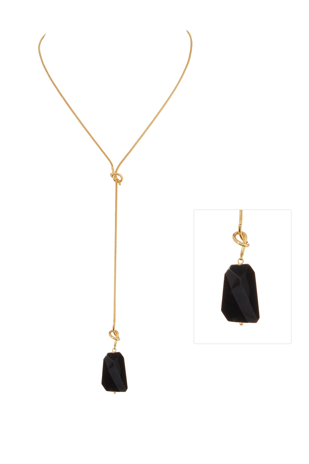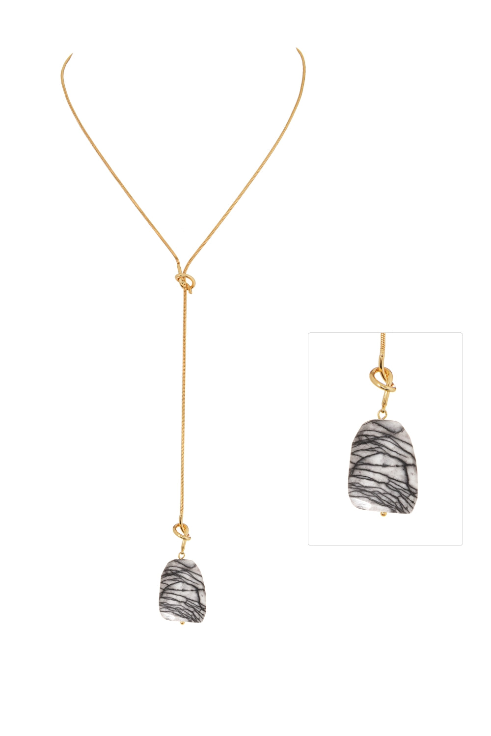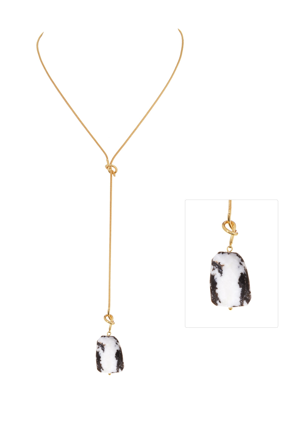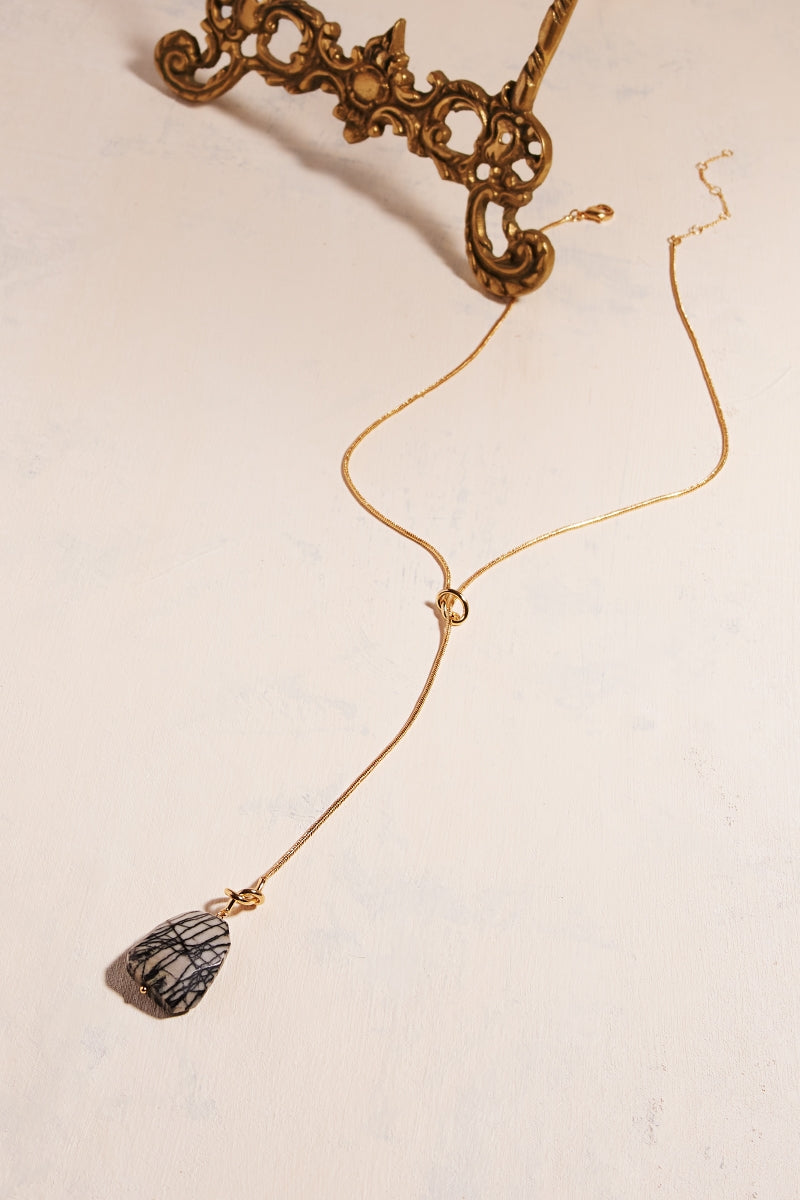 Featuring an 18-inch 18K gold-plated brass chain and a striking 22x30mm waved-cut stone, this unbalanced Y-shape necklace blends sophistication with modern elegance. Its unique design complements any attire, offering a refined contemporary look.
