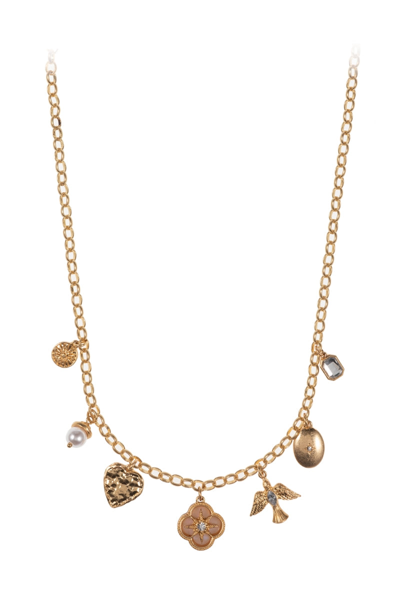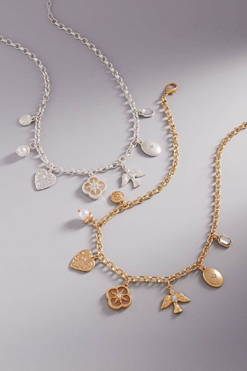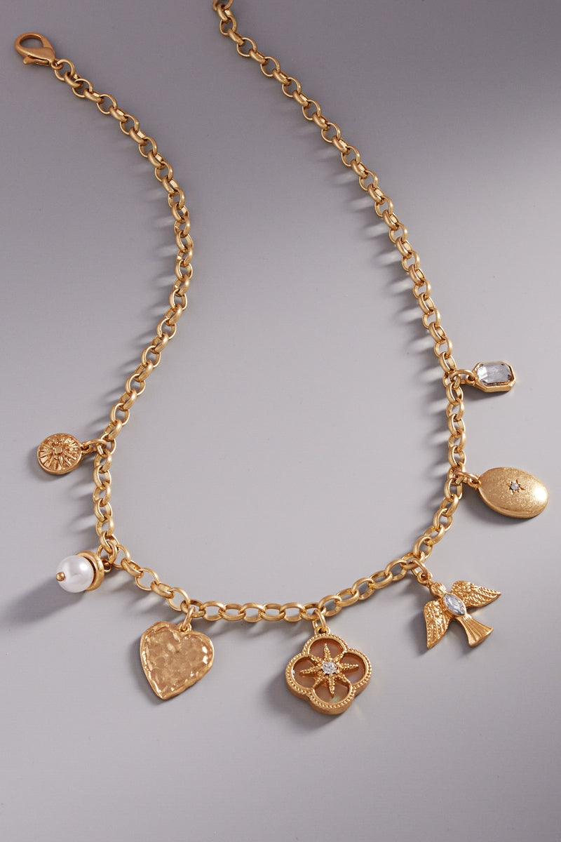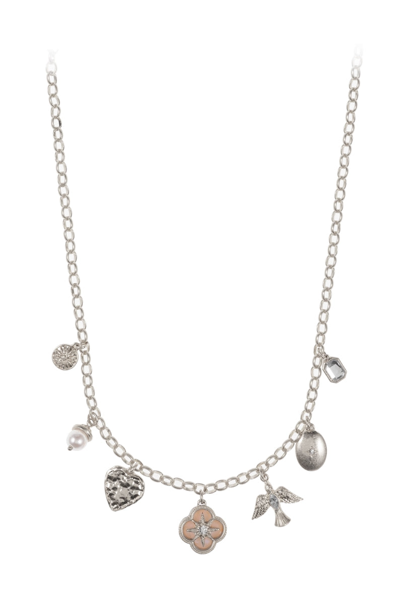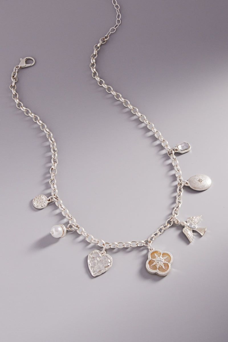 This 16 inch charm necklace features a mix of clover, heart, bird, and oval disk shaped metal charms, creating a uniquely stylish look. With its short length, it's the perfect accessory for any outfit. Elevate your style with this eclectic and eye-catching necklace.