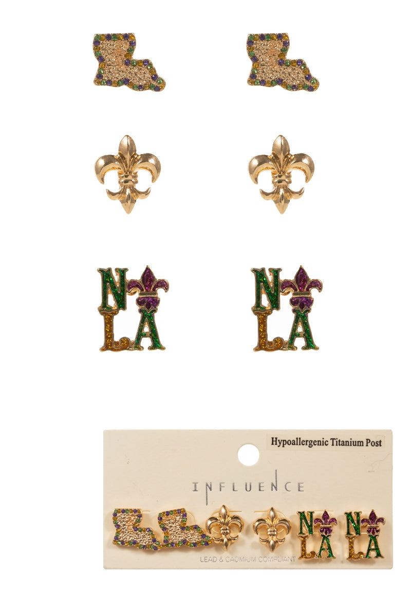Mardi Gras Icons Shaped Enamel 3 Set Earrings