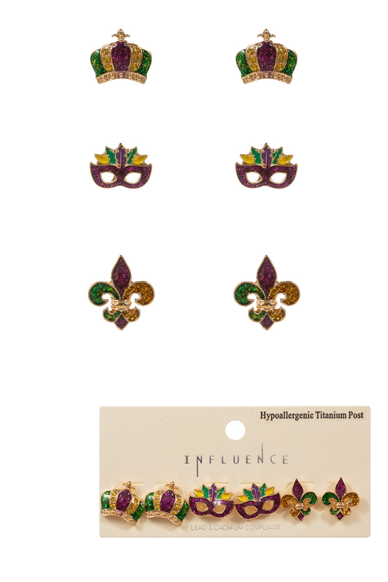 Mardi Gras Icons Shaped Enamel 3 Set Earrings