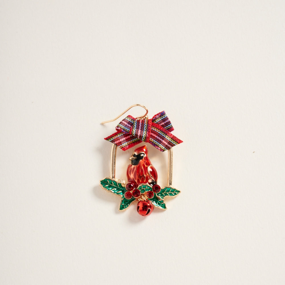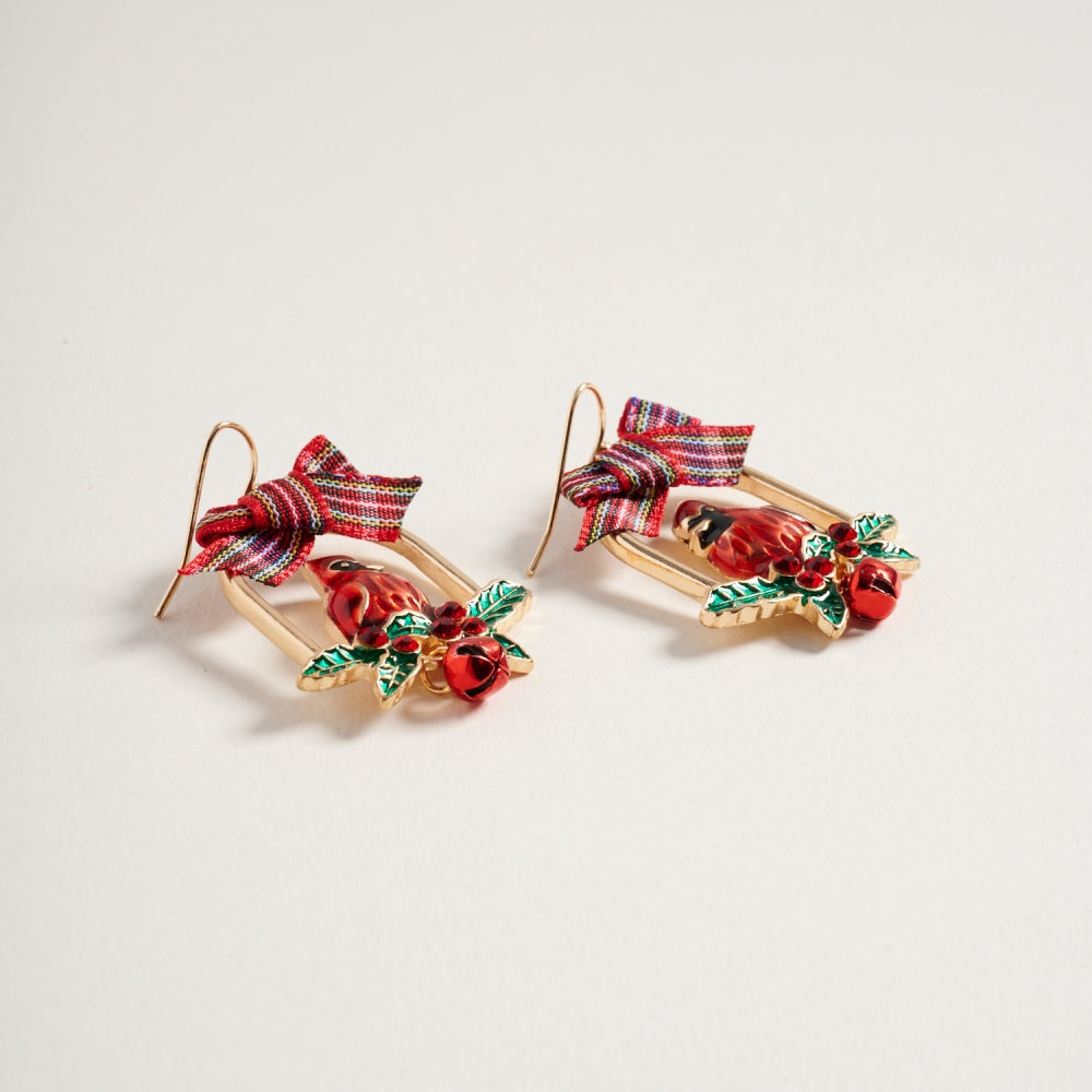 These charming earrings feature a cardinal perched on holly leaves, accented by a festive ribbon and glittering rhinestones. A joyful symbol of holiday warmth.