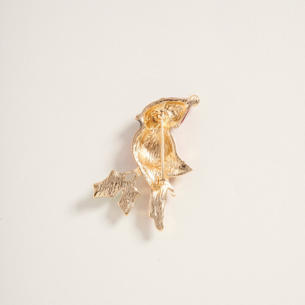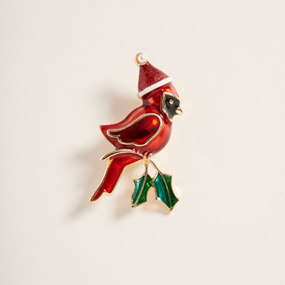 Add a touch of holiday cheer with this brooch showcasing a cardinal in a Christmas hat. A meaningful and whimsical winter accessory.