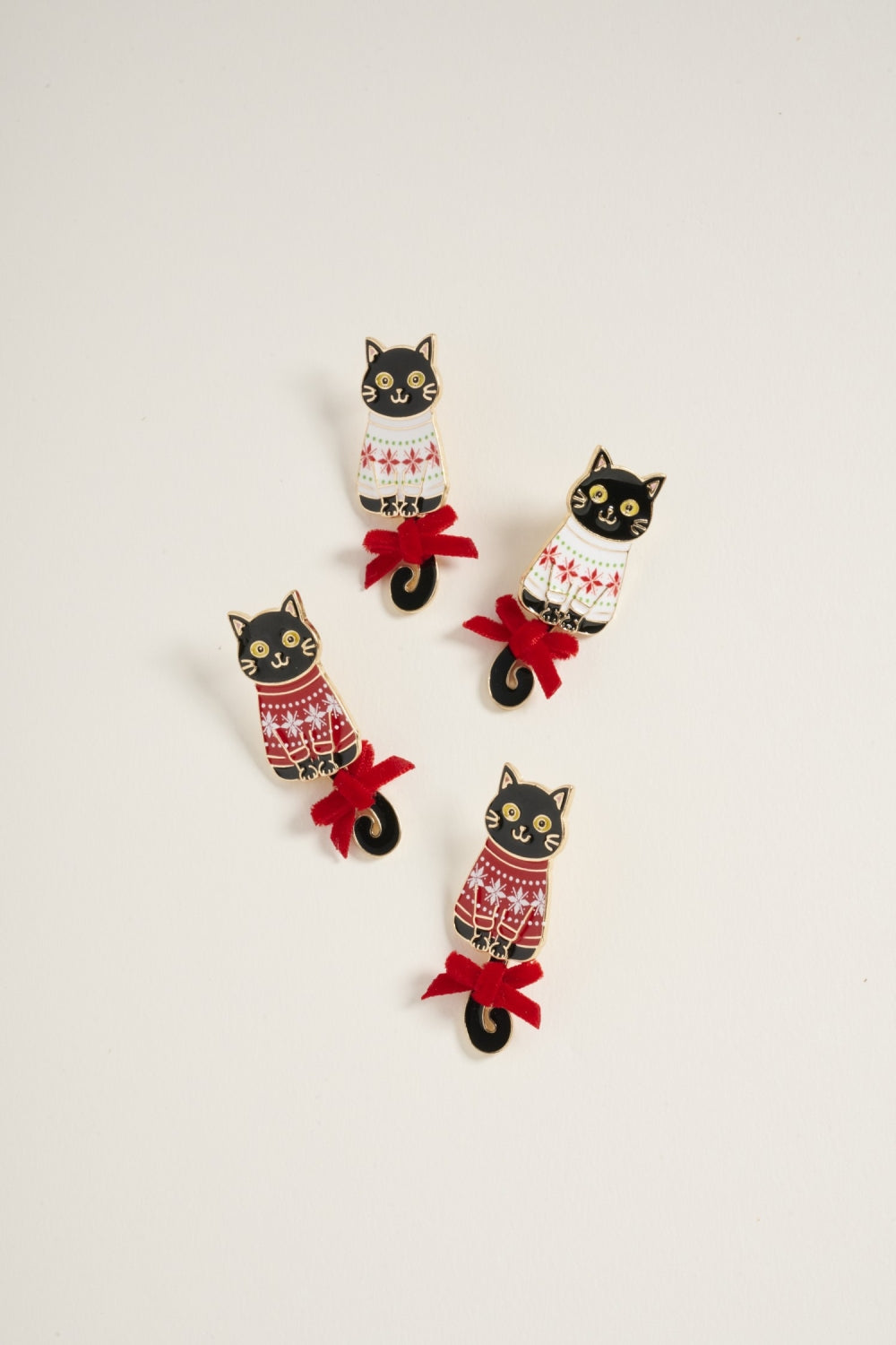 Bring playful holiday cheer to your outfit with these post earrings featuring a cozy cat in a Christmas sweater. A cute ribbon detail adds an extra festive touch.