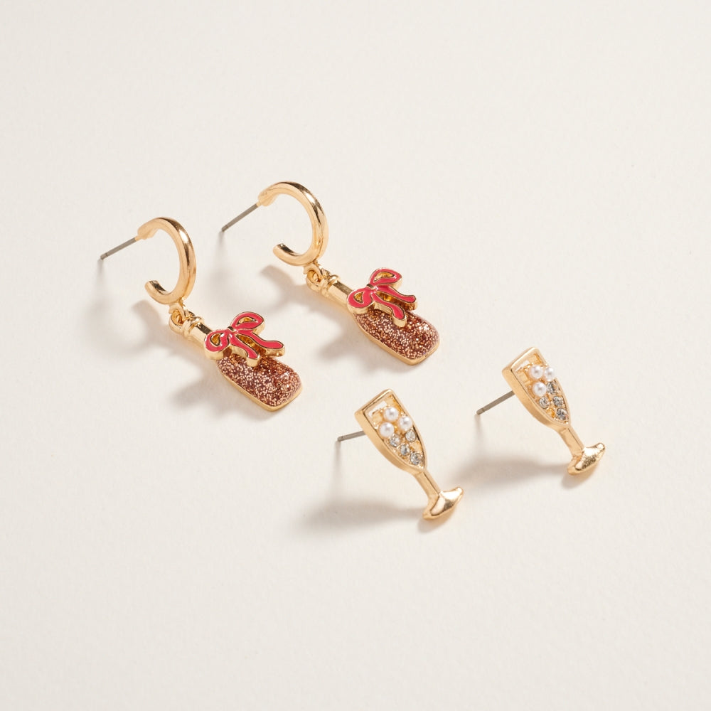 Raise a toast to festive fun with this 2-piece earring set featuring a glittering champagne bottle and glass, detailed with pearls, rhinestones, and a delicate ribbon accent. Perfect for New Year's or party nights!