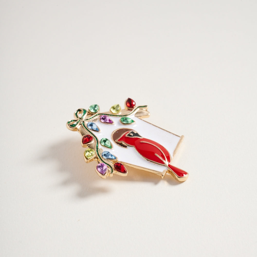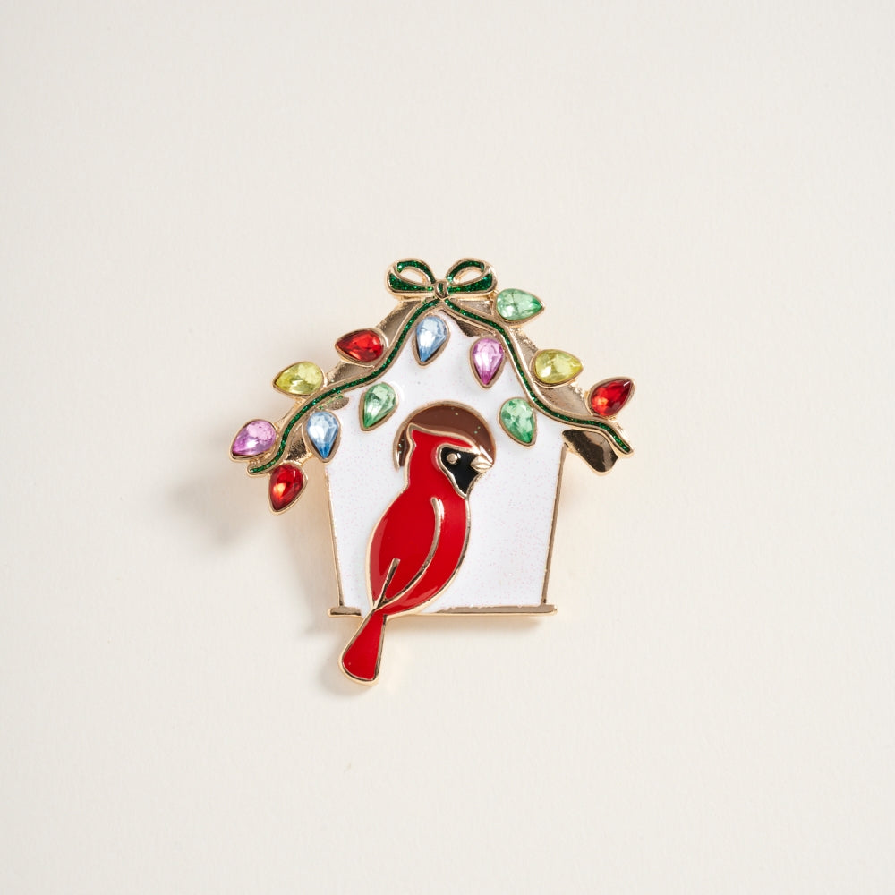 Celebrate winter charm with a cozy cardinal house brooch accented by sparkling rhinestones for a festive look.