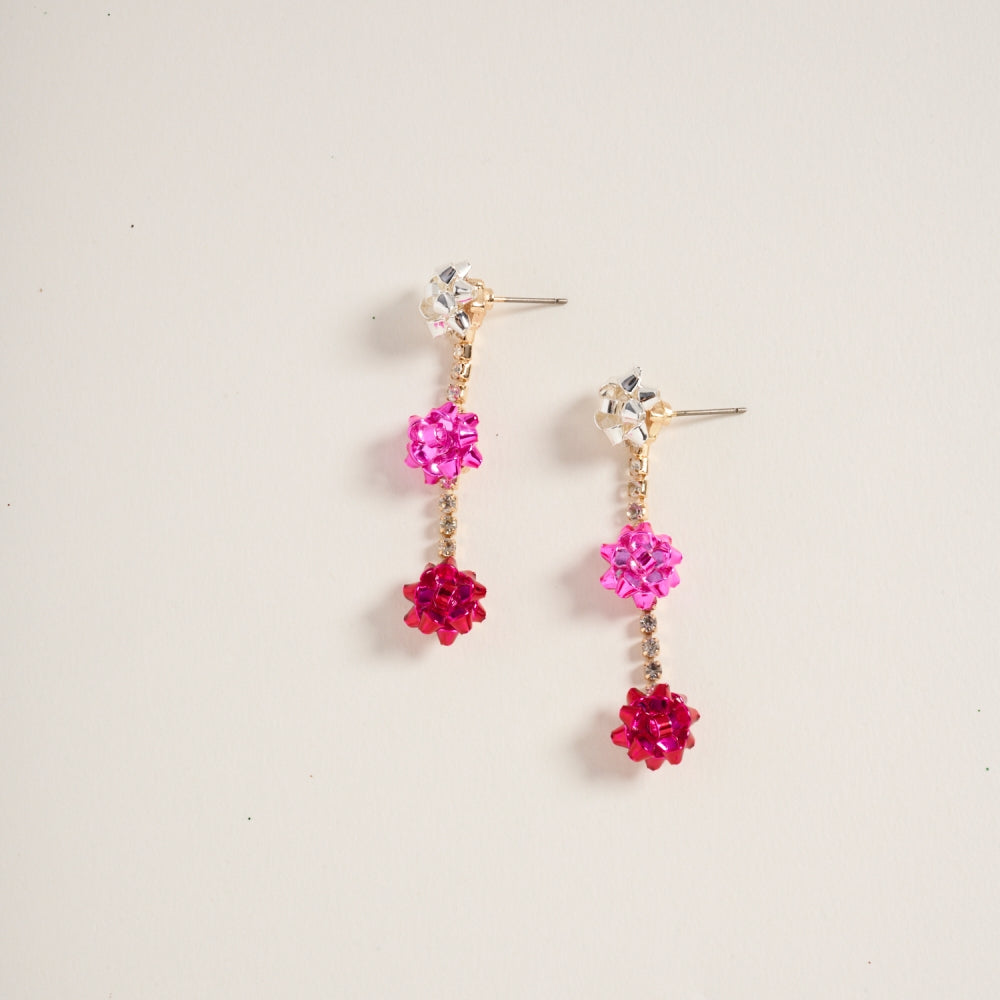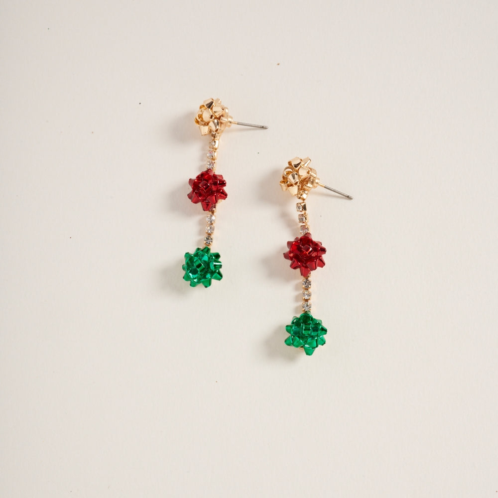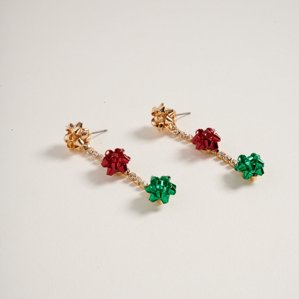 Wrapped like the perfect gift, these colorful bow earrings with rhinestone chains are festive and elegant. A great accessory for parties or a cute stocking stuffer.