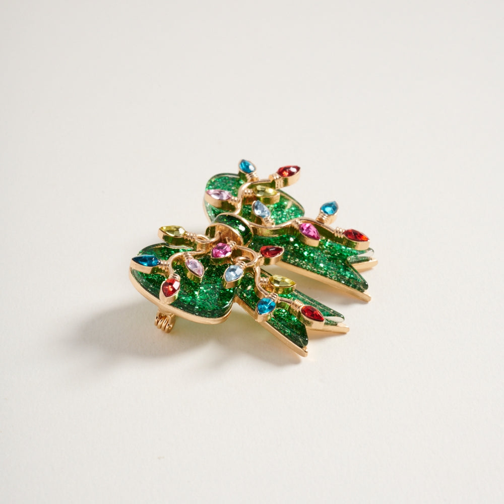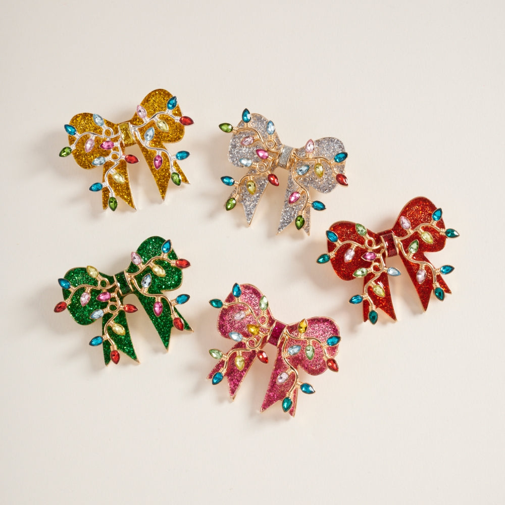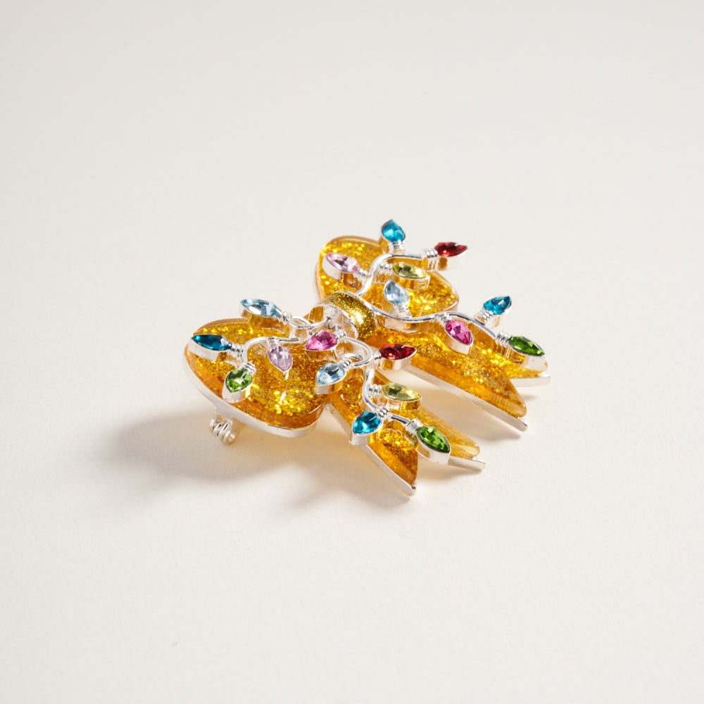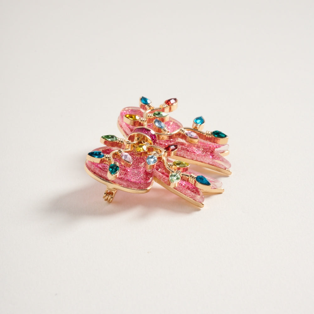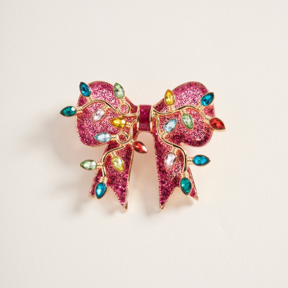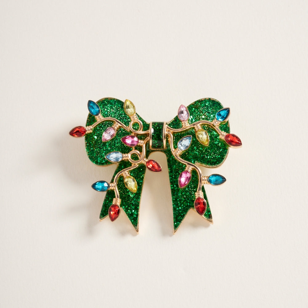 This brooch features a glittery Christmas bow ribbon accented with mini lights for a festive glow. A fun and eye catching holiday accessory.