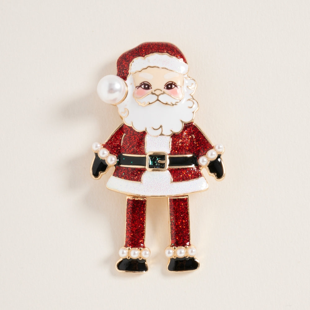 A merry blend of sparkle and sophistication, this brooch features Santa Claus in glitter detail, trimmed with luminous pearls.