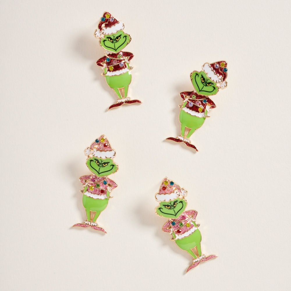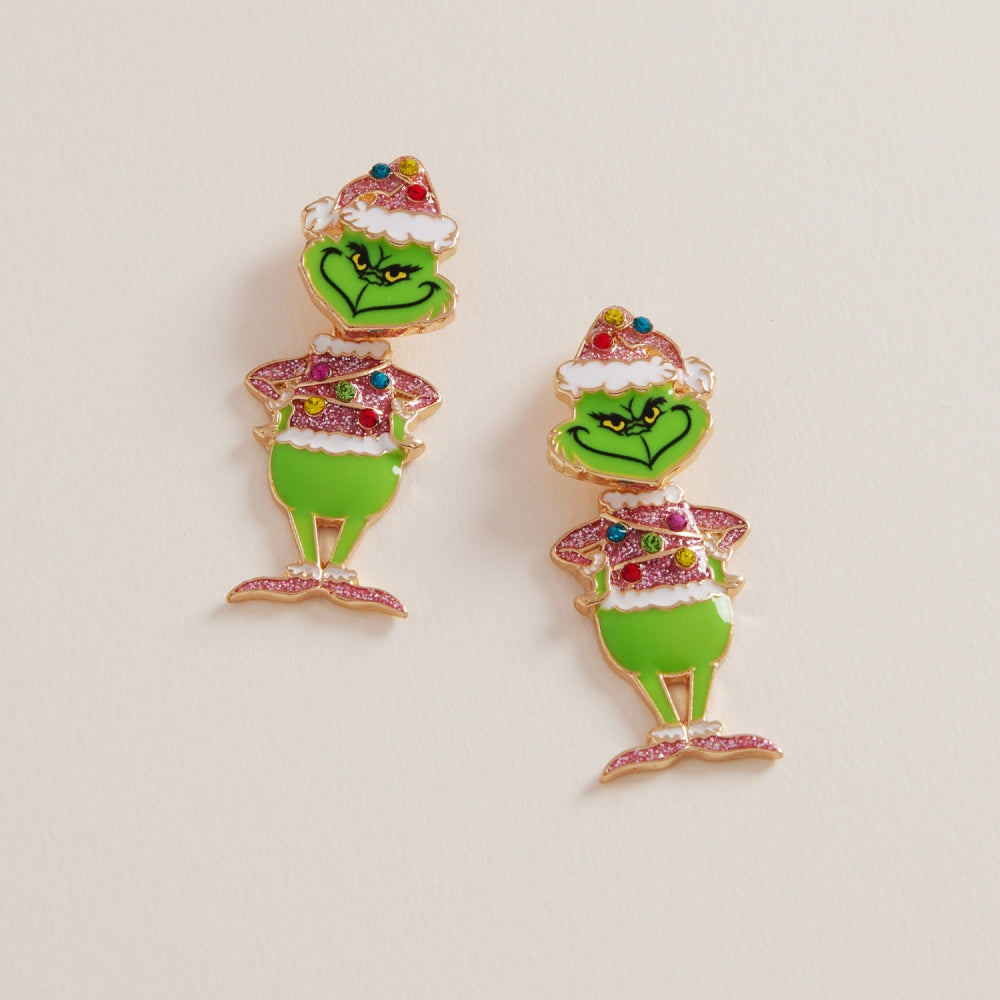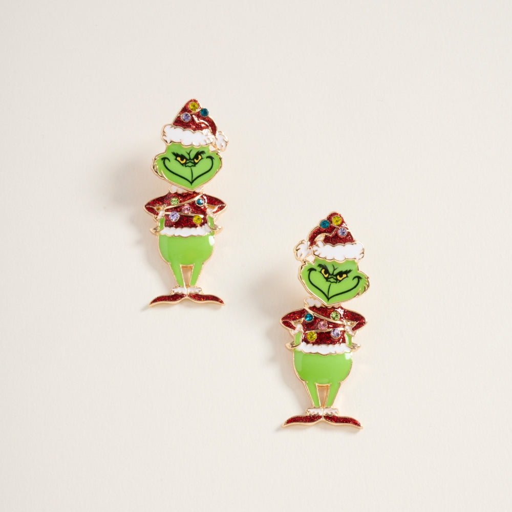 Make spirits bright with these festive post earrings featuring a cheeky green monster and sparkling rhinestones.