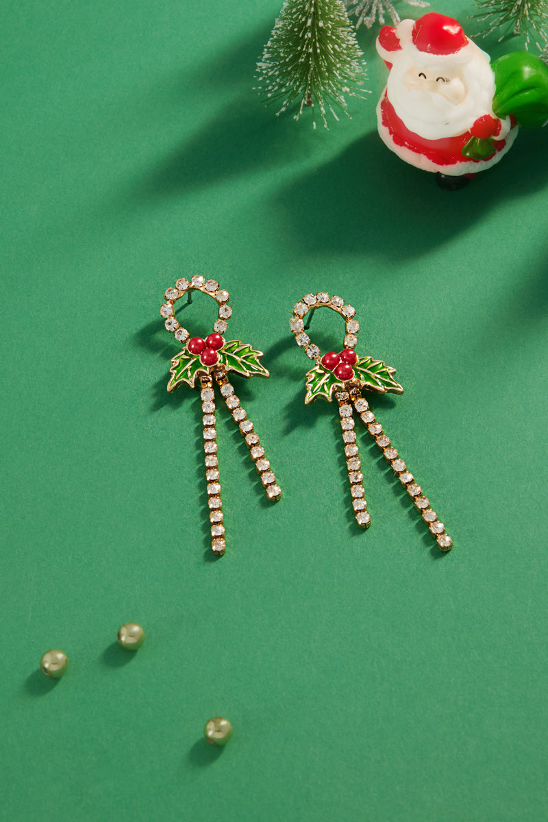 Enhance your look with our elegant 2.25 inch bow shaped earrings. Embellished with rhinestones and a chain featuring an enamel holy leaf, these earrings will add a touch of sophistication to any outfit. The titanium post ensures durability and comfort.