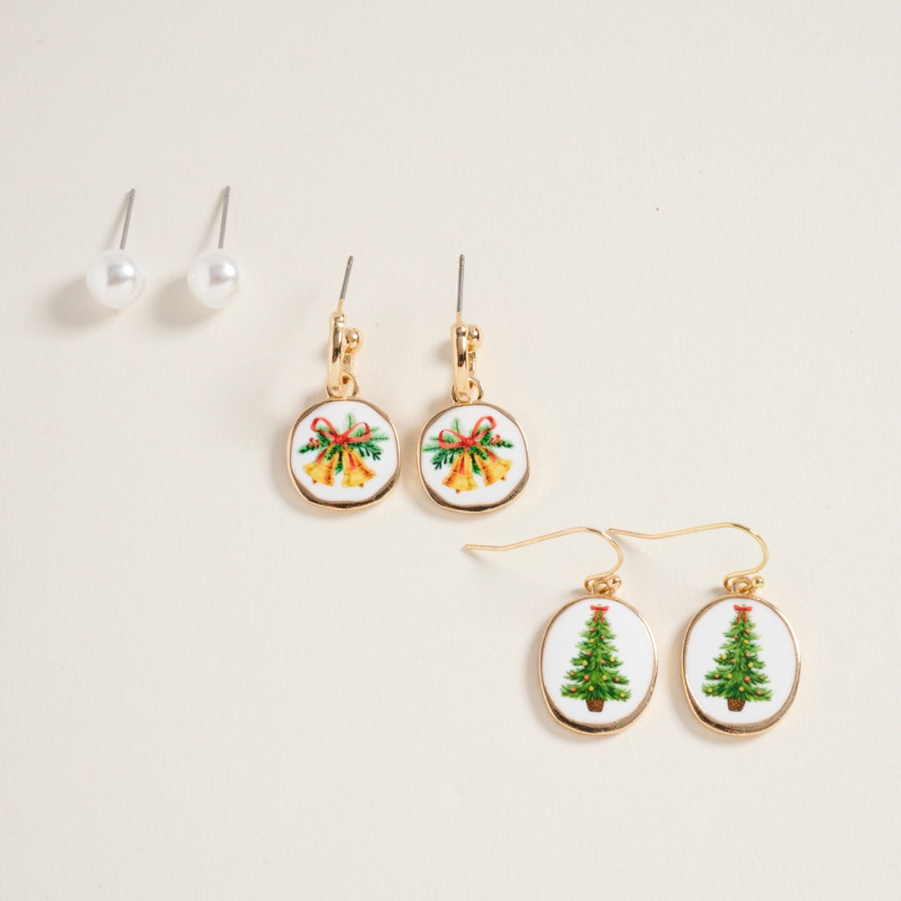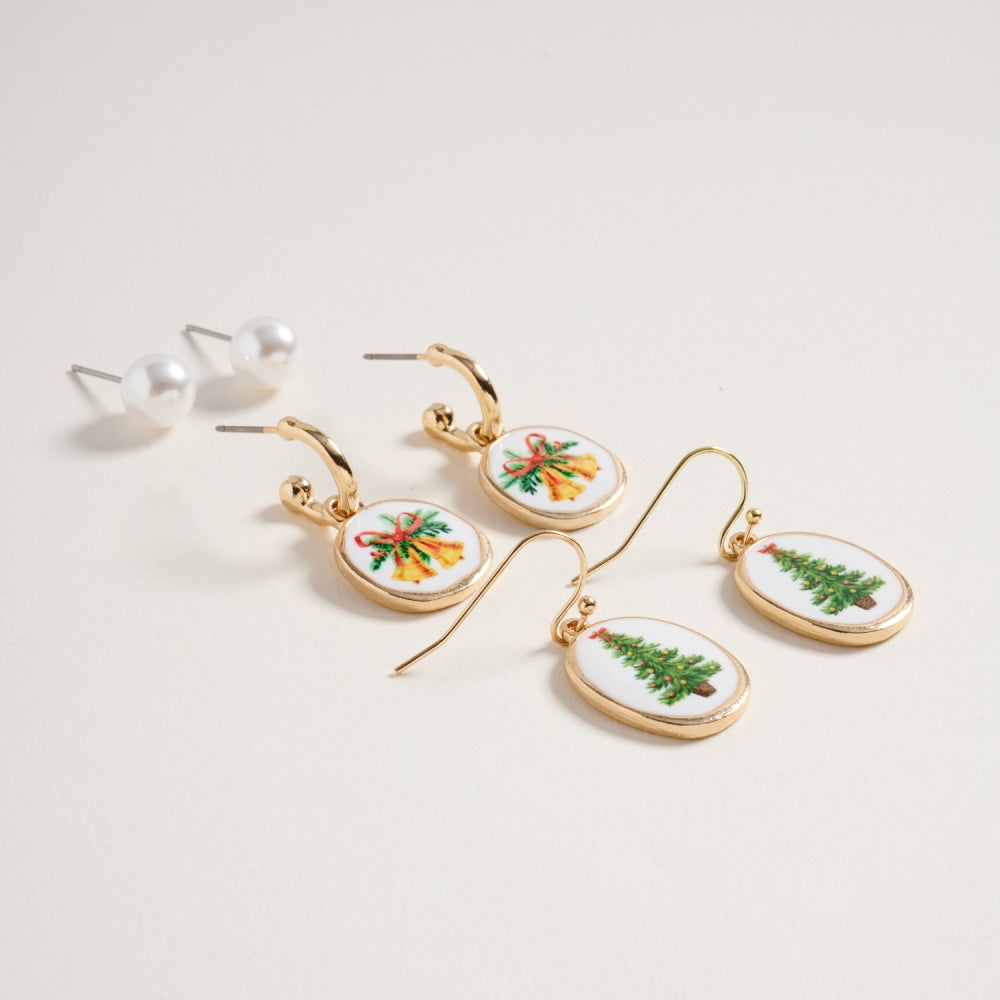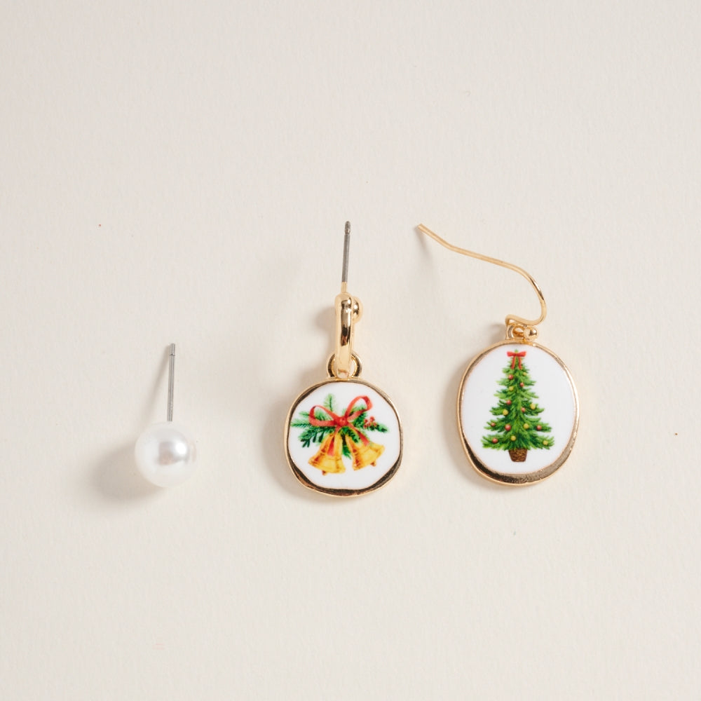 Celebrate the season with this festive 3-piece earring set featuring a Christmas tree, bell, and pearl-accented enamel stone designs. Perfect for mixing and matching all holiday long.