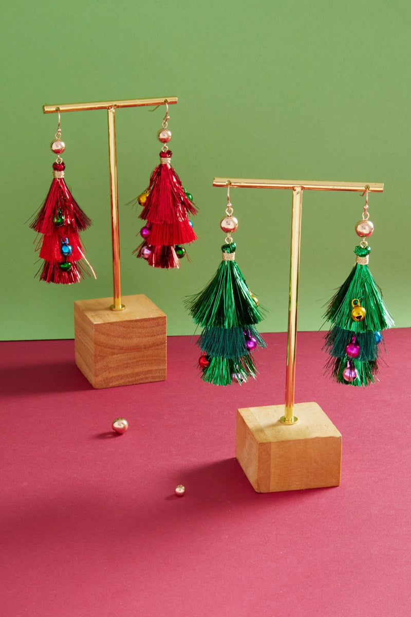 Celebrate the season in style with tree shaped tassel earrings featuring tiny ornaments. A playful pick for holiday parties or gift tables.