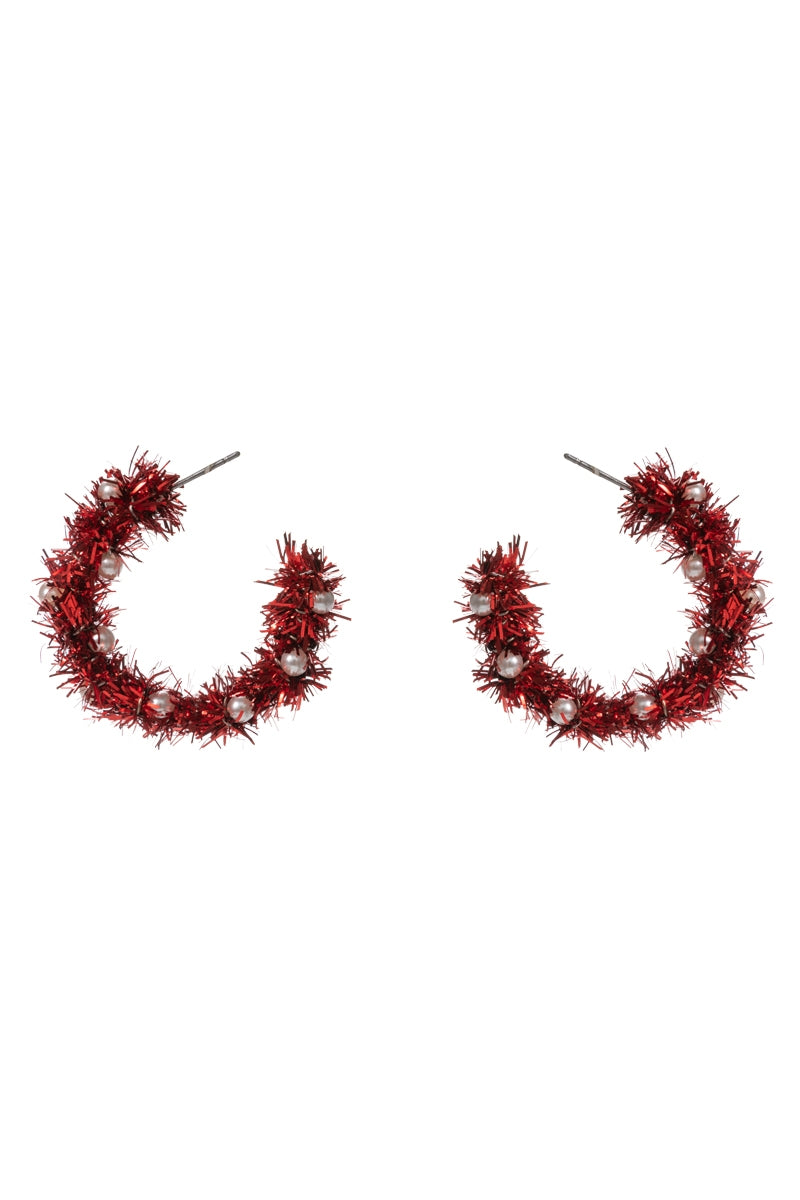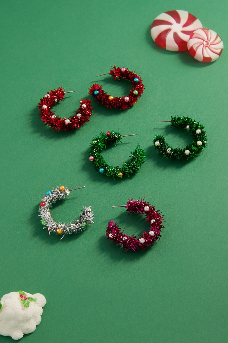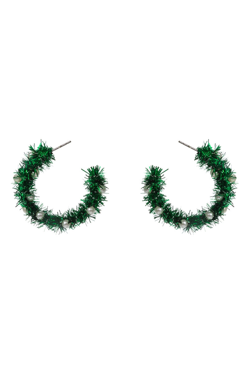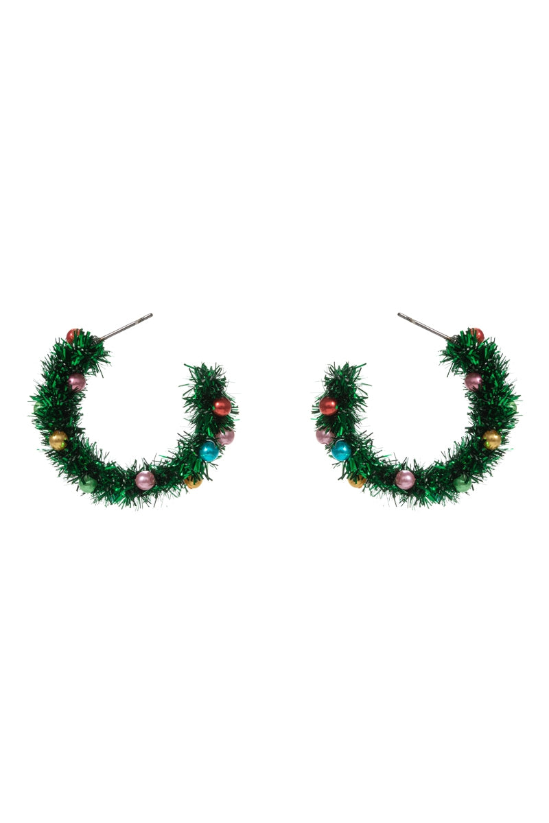 These hoop post earrings feature elegant Christmas wreaths accented with pearls. A festive and refined touch for holiday looks.