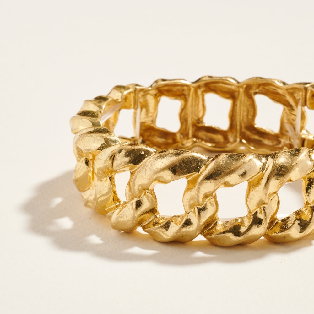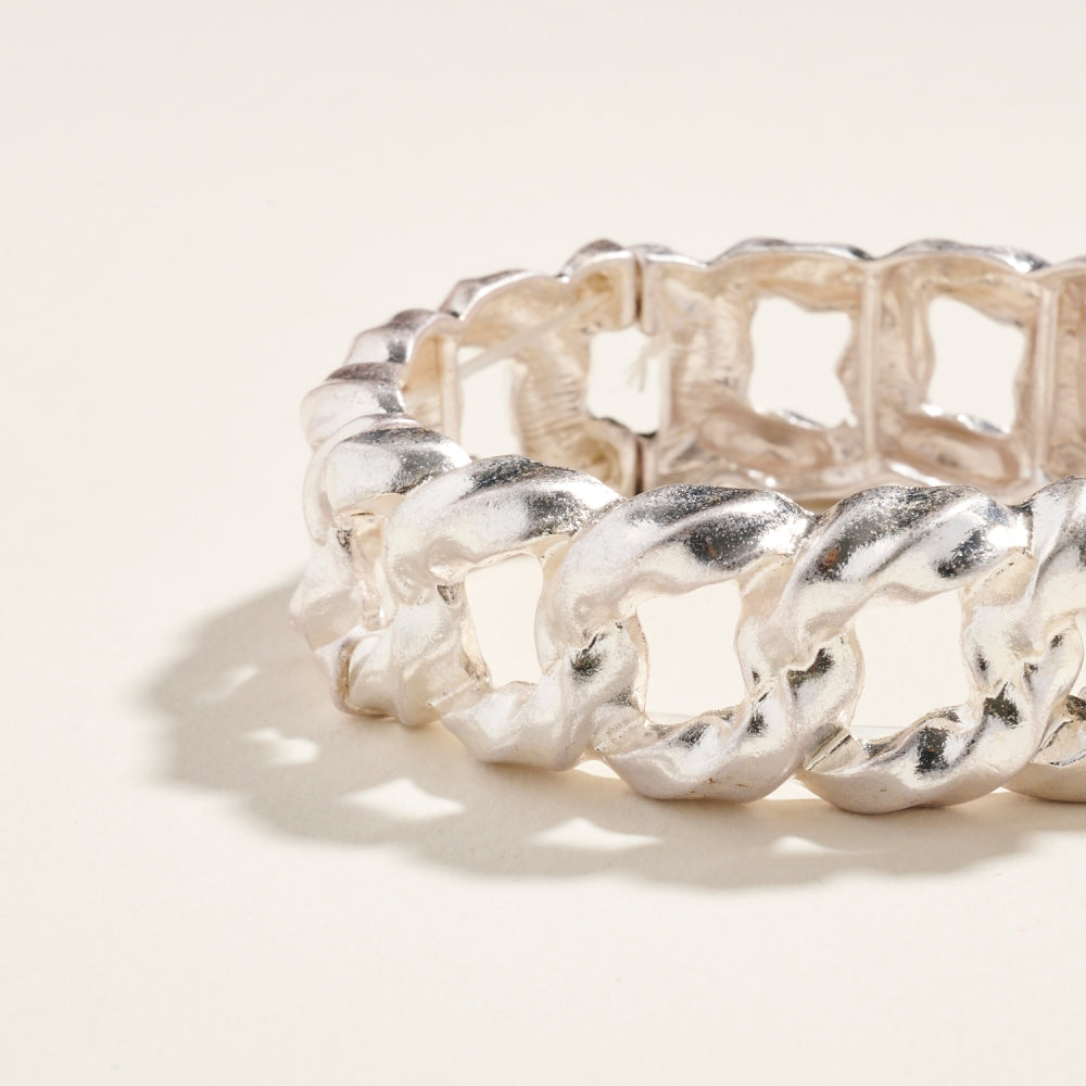 With a hinged stretch fit, this chunky bracelet blends comfort and style. The metal construction gives it a polished, statement-making presence for any collection.