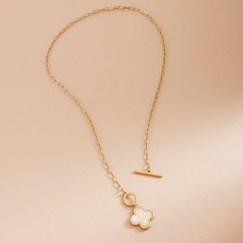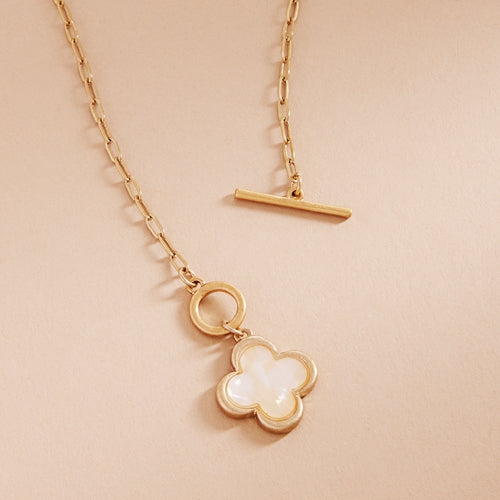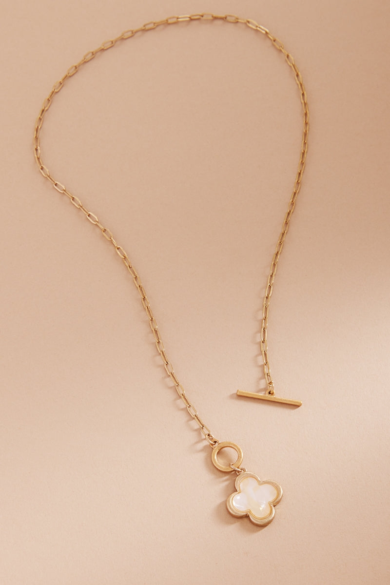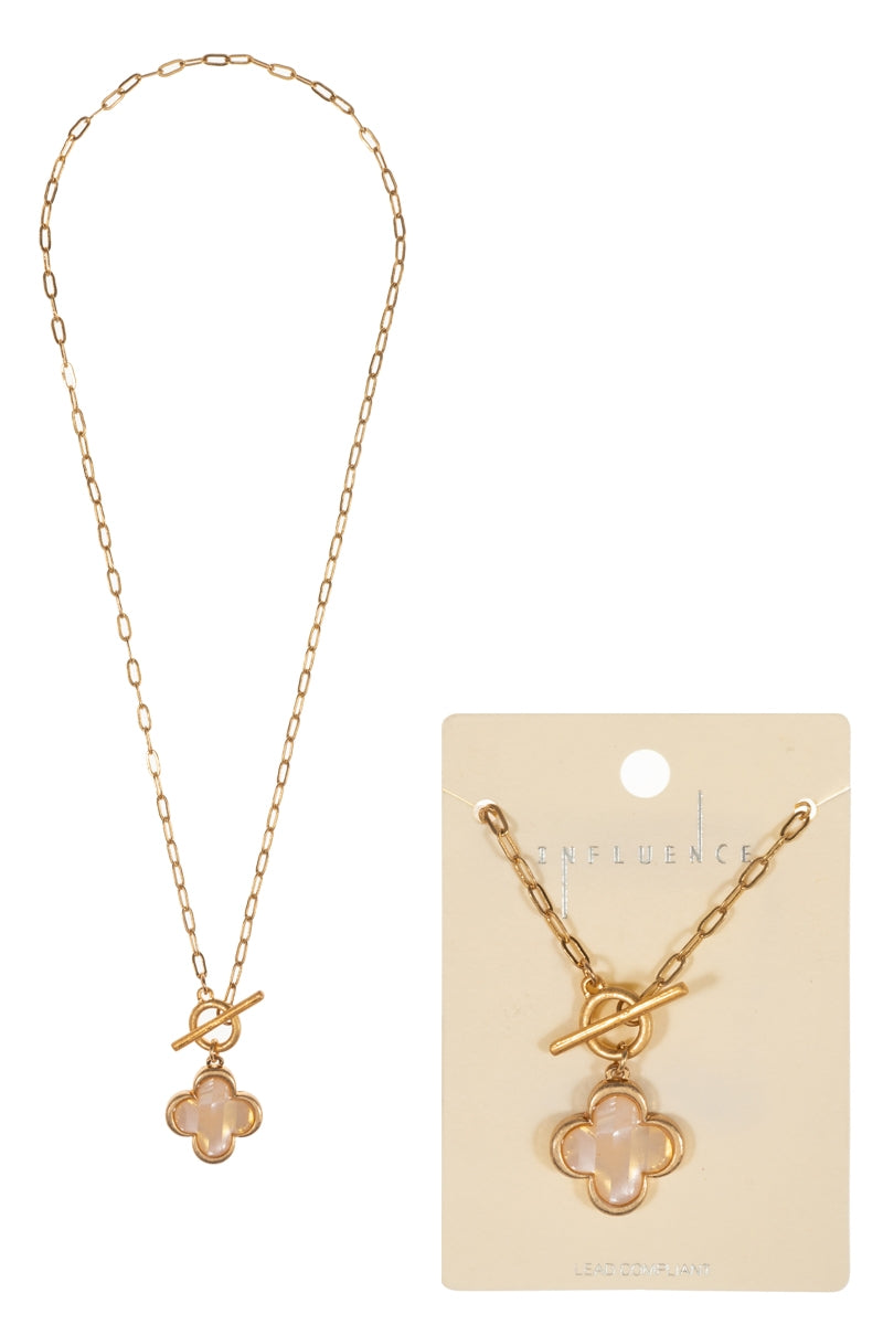 This clover-shaped necklace features a unique shell effect paper charm that adds a touch of natural beauty to your look. With a length of 16 inches, it sits perfectly on your neck, making it a versatile accessory for any outfit. Enhance your style with this delicate and elegant necklace.