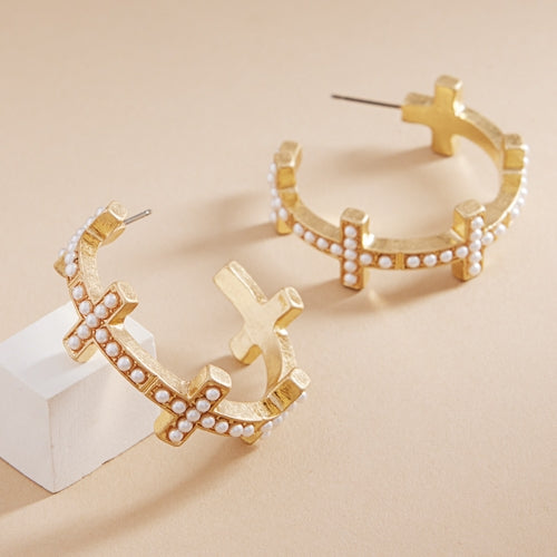 Expertly crafted with hypoallergenic titanium posts, these 1.5 inch cross-shaped pearl paved hoop earrings make a stylish and safe addition to any jewelry collection. With a unique and eye-catching design, these earrings are perfect for adding a touch of elegance to any outfit.