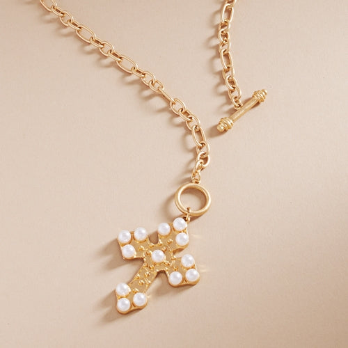 Expertly crafted, this elegant 30-inch cross necklace features a beautiful cream pearl, adding a touch of sophistication to any outfit. With its versatile length, it can be worn for any occasion, making it a perfect addition to your jewelry collection. Invest in timeless style with this stunning necklace.