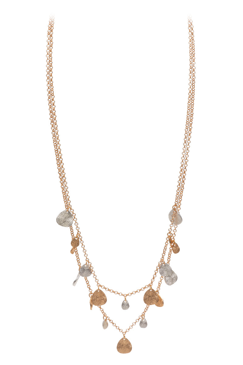 This etched and textured metal charm necklace measures 16"-18" in length. The layered design adds a touch of elegance to any outfit.
