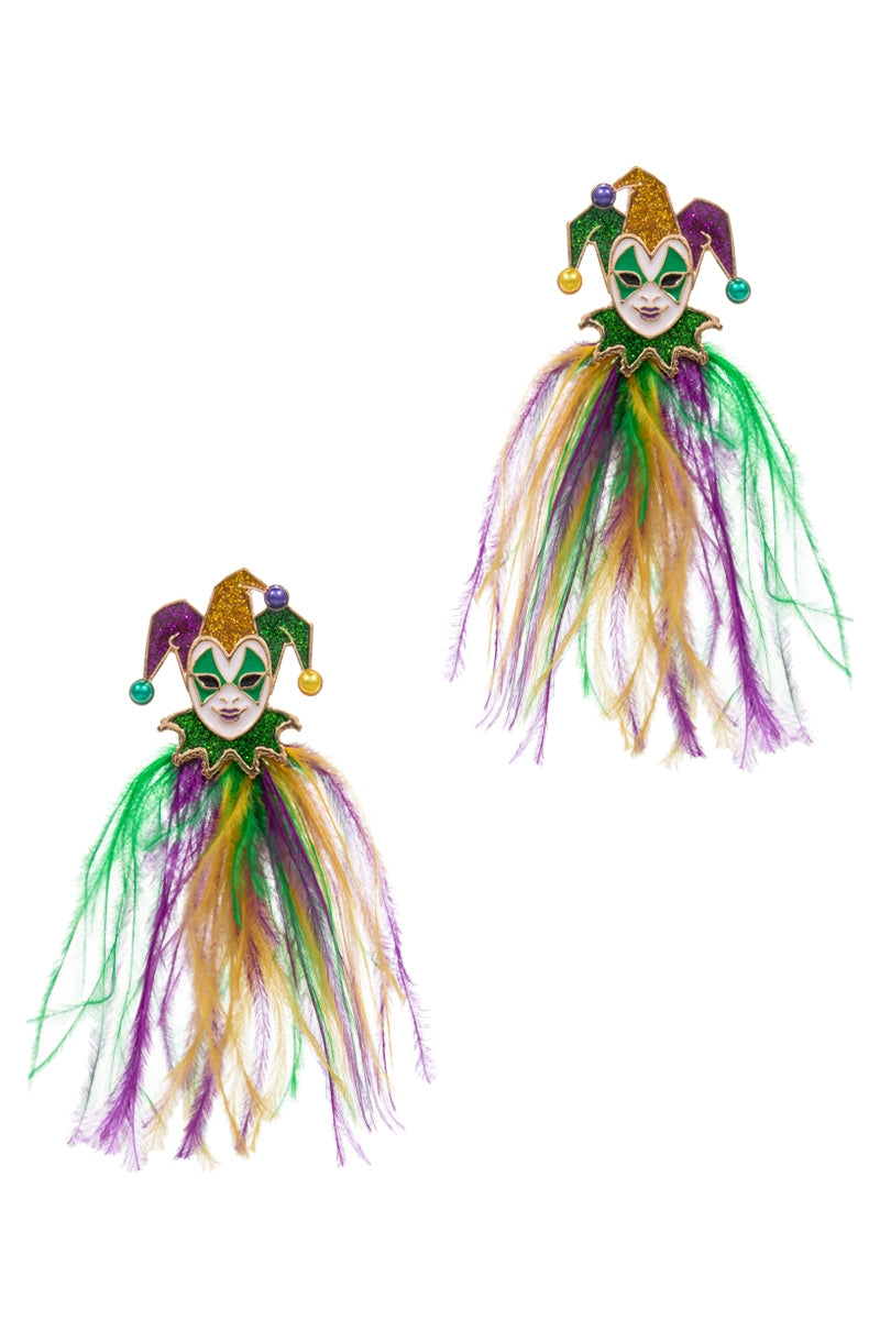 Expertly crafted with a 4 inch feather and Mardi Gras jester post, these earrings are sure to make a statement. Let the colorful feathers and festive design add a touch of whimsy to any outfit. Perfect for parties, festivals, and special occasions.