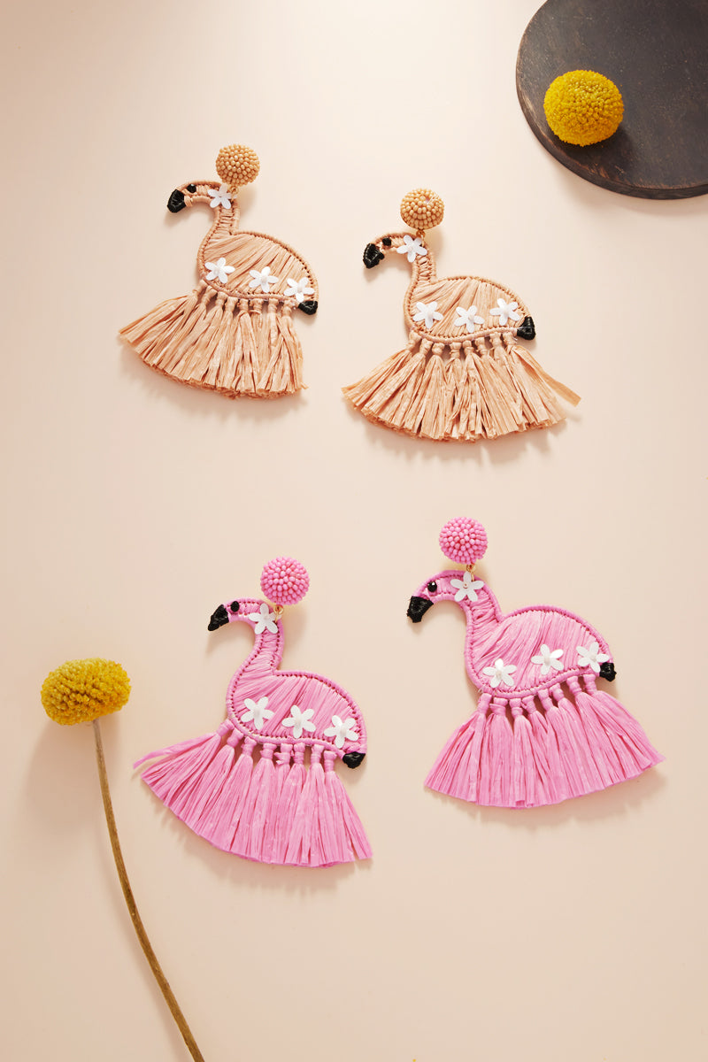 Expertly crafted with lightweight raffia, these 9.6 inch Flamingo Raffia Post Earrings add a touch of elegance and playfulness to any outfit.