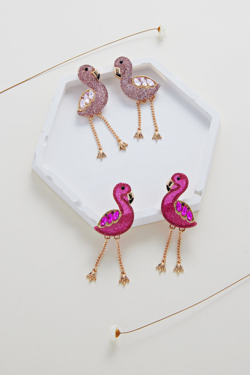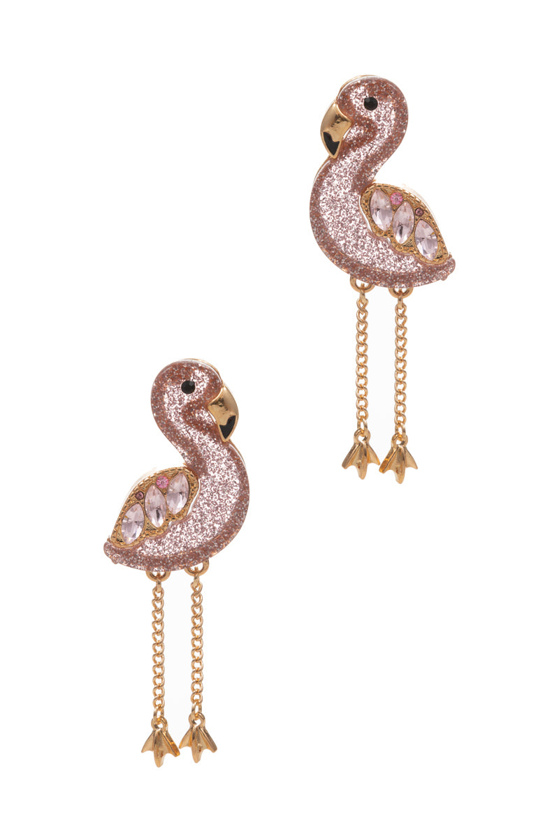 Enhance your outfit with these 2.25-inch Flamingo earrings, adorned with sparkling rhinestone wings. Add a touch of glamour and fun to any look. Perfect for any occasion.