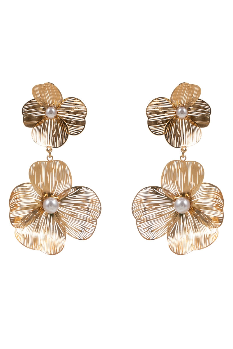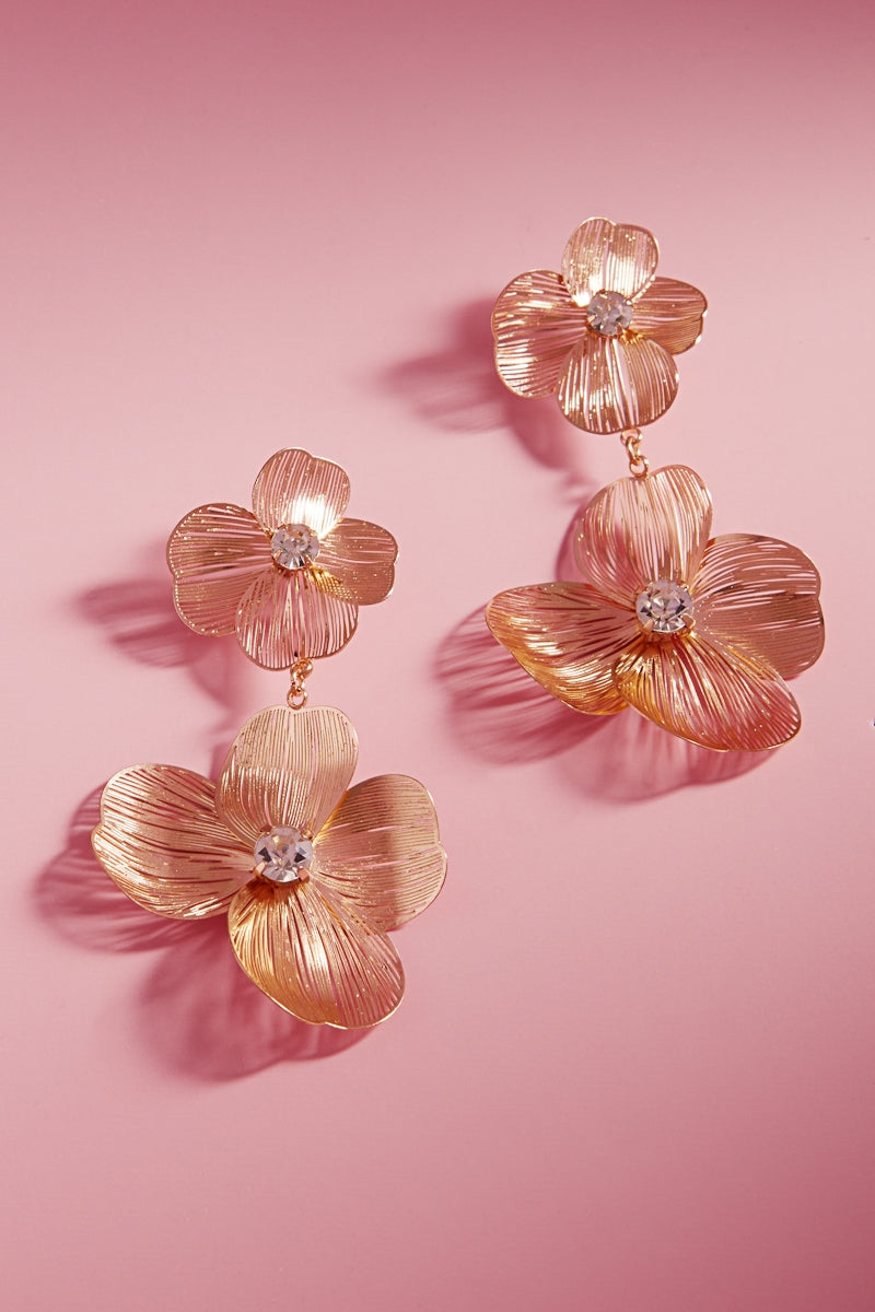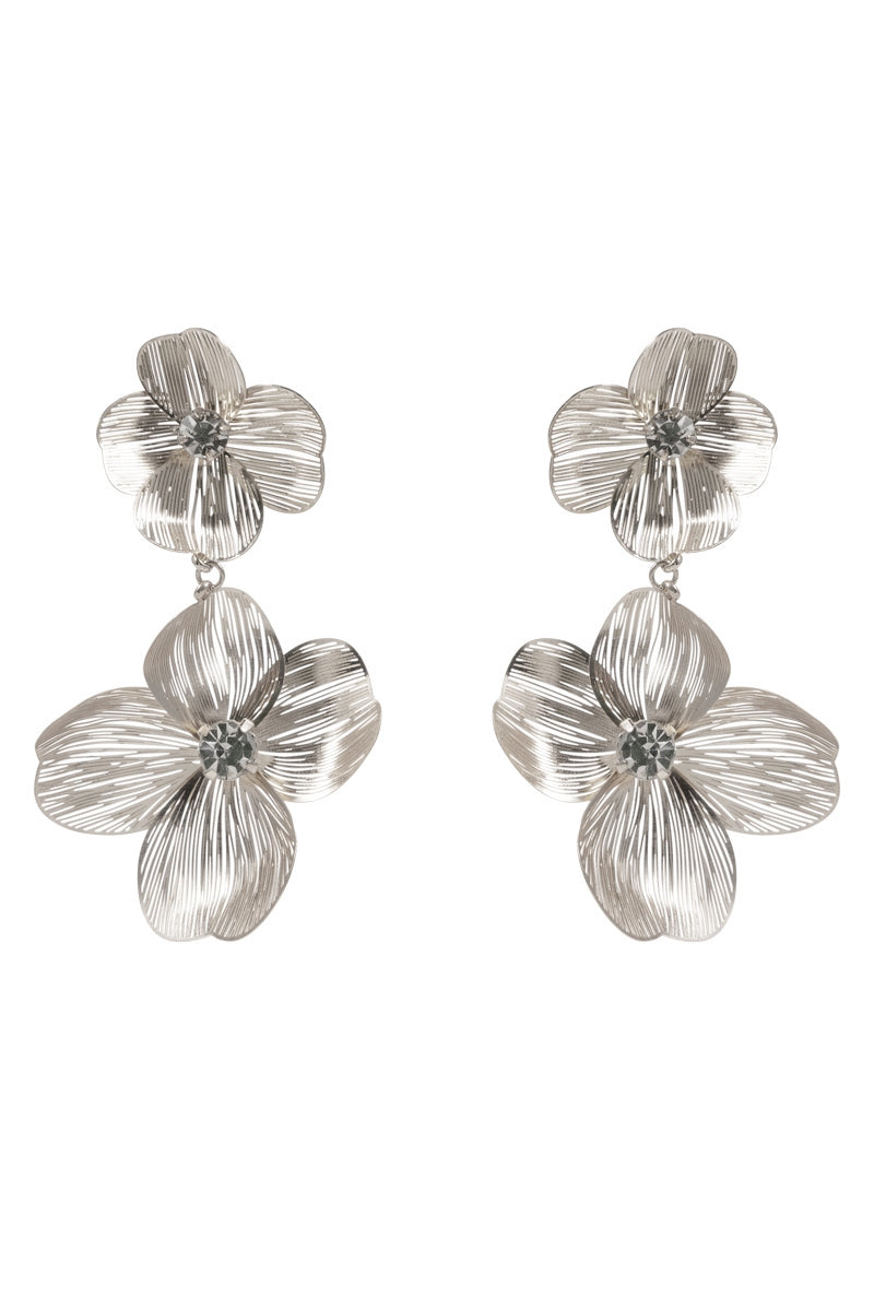 These 2.75 inch flower-shaped earrings are made from brass metal and feature a clear rhinestone on a titanium post. With their elegant and delicate design, they will add a touch of glamour to any outfit. Perfect for any occasion, these earrings are a must-have for any jewelry collection.