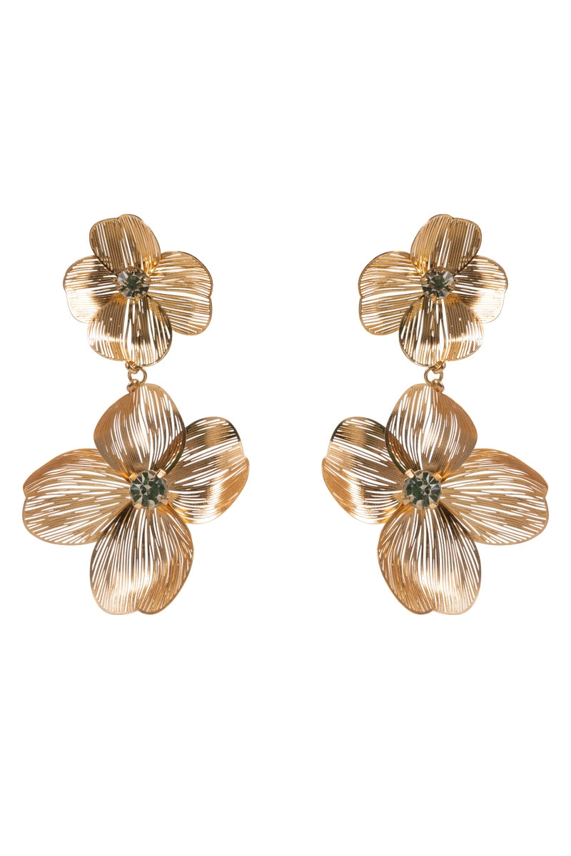 Flower Brass Metal Clear Rhinestone Post Earrings