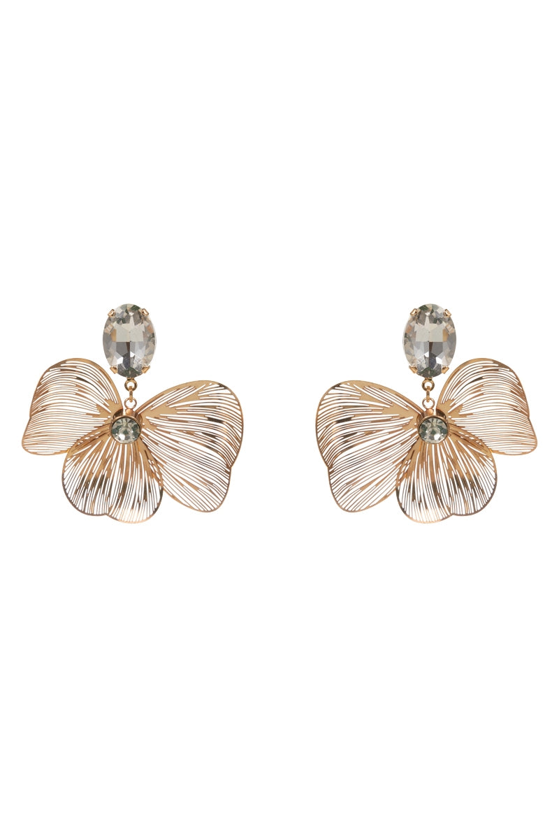 Flower Brass Metal Clear Rhinestone Post Earrings