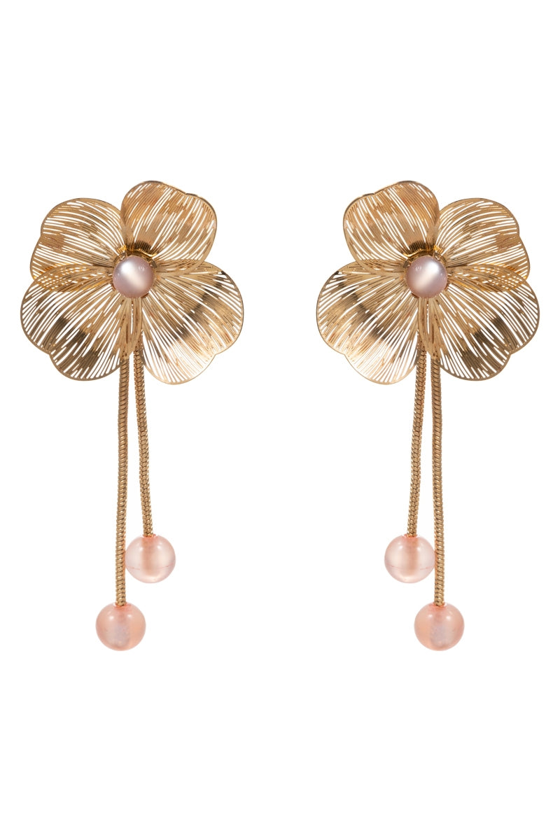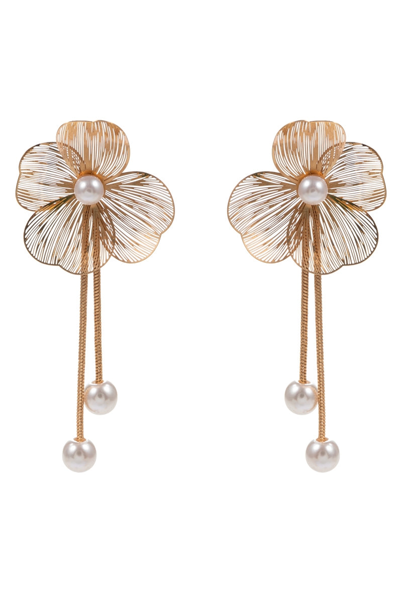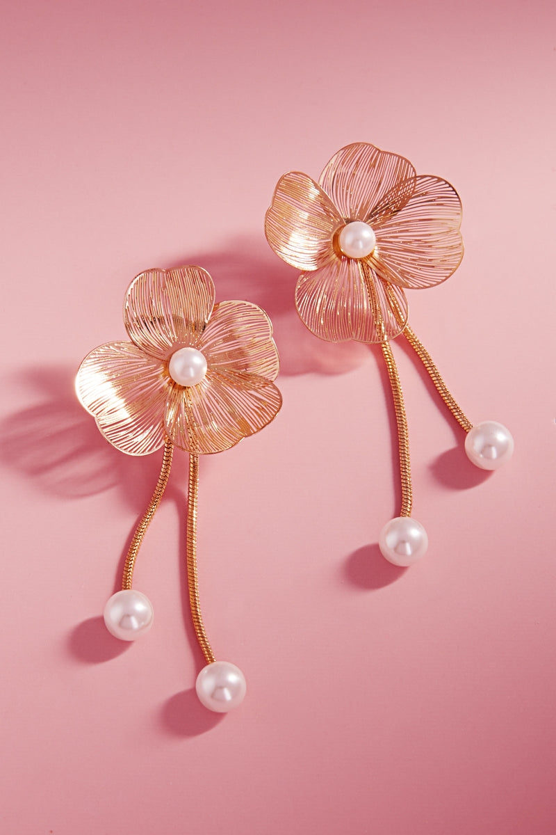 Enhance your outfit with these elegant 3 inch flower shaped brass metal earrings. The titanium posts ensure secure and comfortable wear, while the pearl accents add a touch of sophistication. Elevate your look with these stunning earrings.