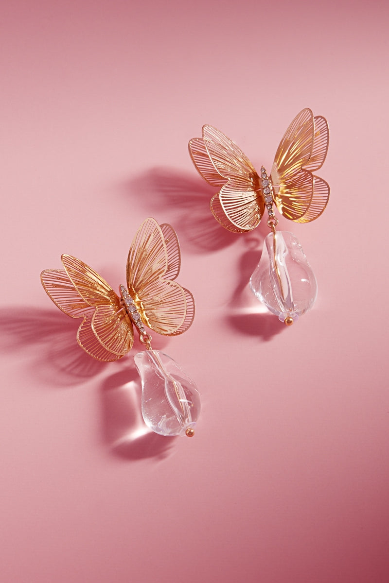 Expertly crafted, these butterfly-shaped earrings feature a 2 inch brass metal design with a clear teardrop titanium post. These earrings are both elegant and durable, providing a unique addition to any outfit. Embrace the beauty and versatility of these stunning earrings.