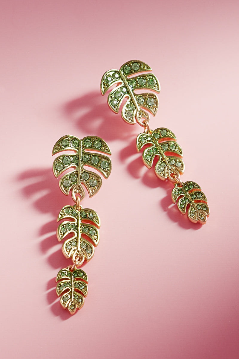 Expertly crafted 2" Monstera Color Coated Stone Pave Post Earrings add a touch of sophistication to any outfit. These stunning earrings feature a unique Monstera design and are adorned with colorful stones, adding a pop of color to your look. Perfect for both casual and formal occasions.