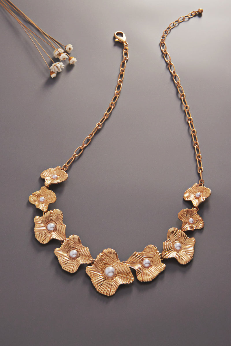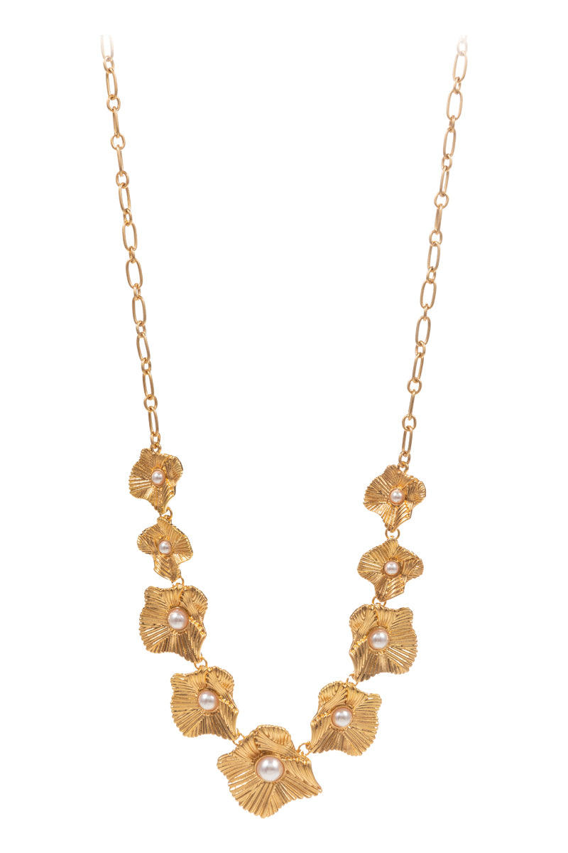 Adorned with lustrous pearls on a delicate flower shaped chain, this necklace adds a touch of vintage charm to any outfit.