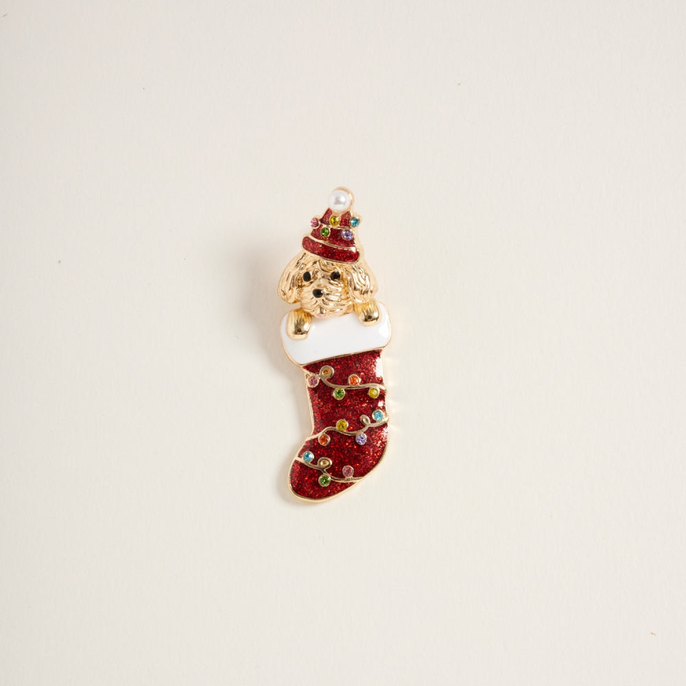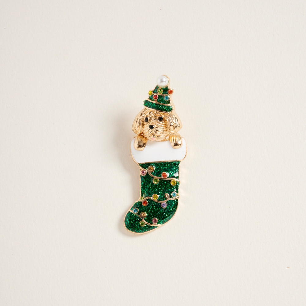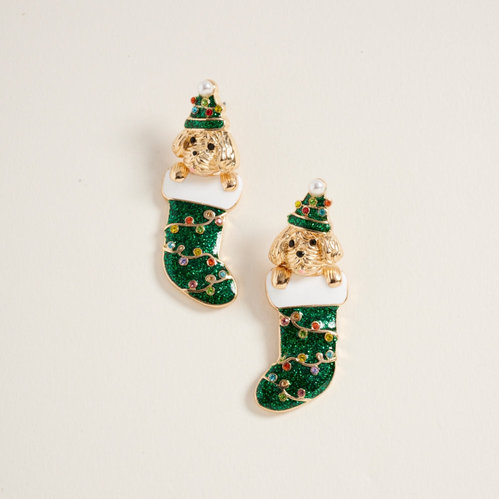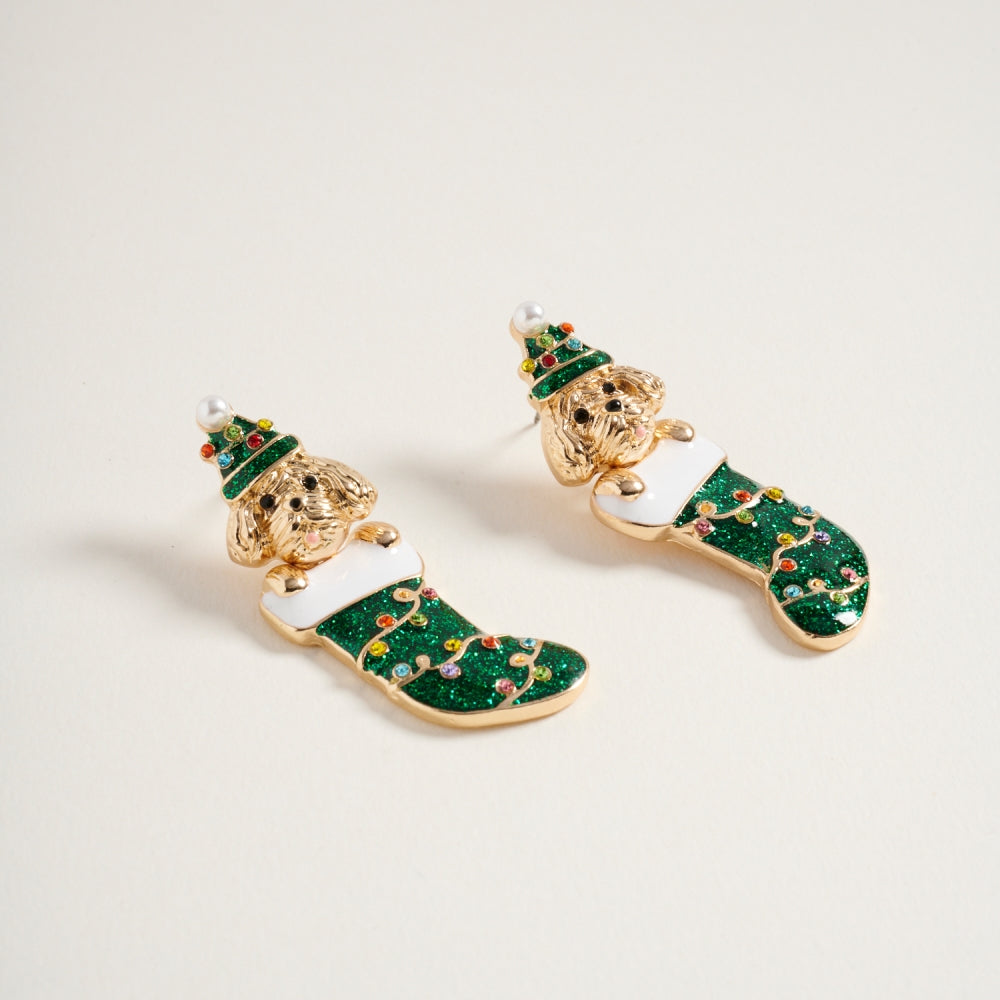 These post earrings combine holiday glitter with a precious dog peeking from a Christmas stocking, making them a fun and festive accessory for the season.