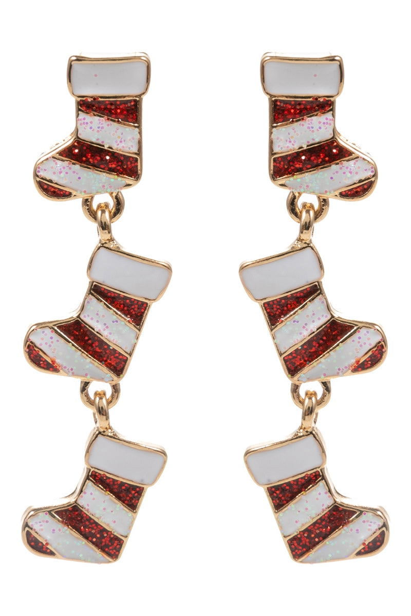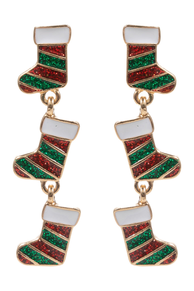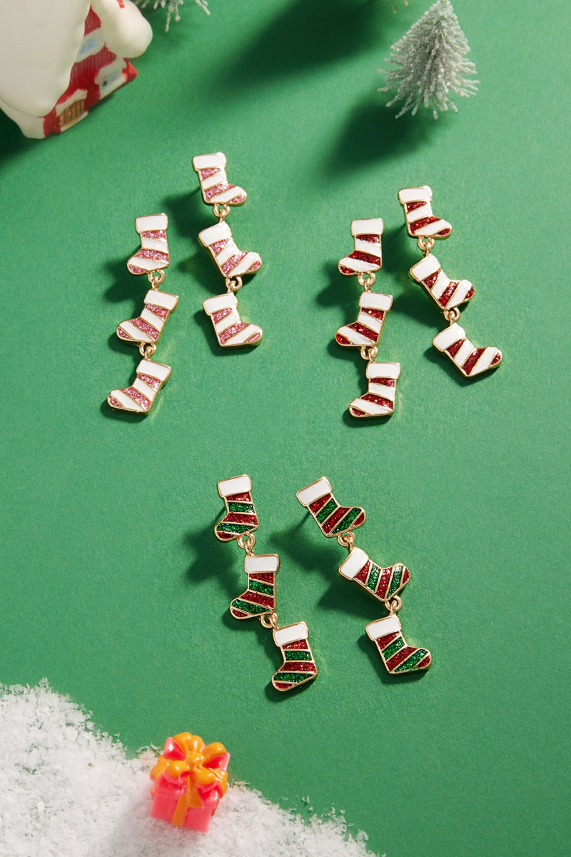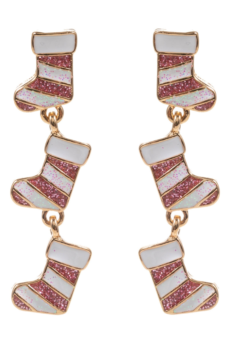 These Christmas stocking earrings combine classic holiday shapes with glittery detail for a bold and playful winter accessory.