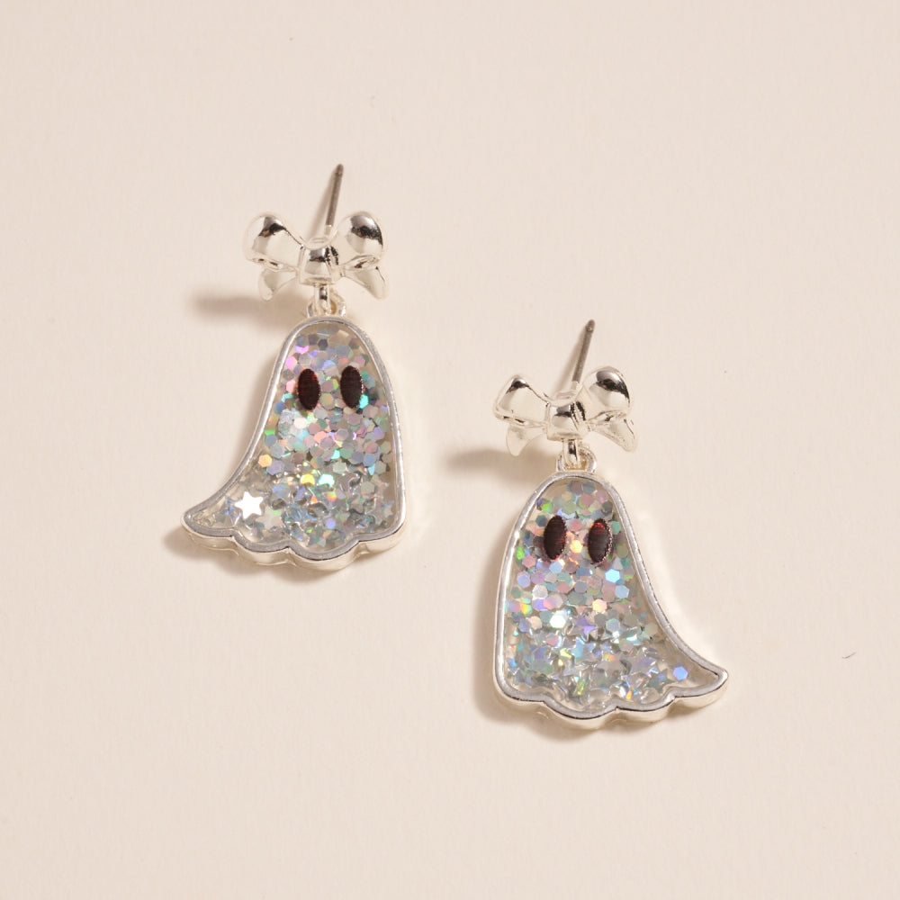 Shimmer through spooky season with ghost earrings that feature a glittery shine and a sweet bow accent. Great for October events or casual fall wear.
