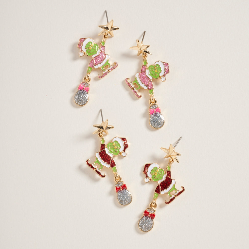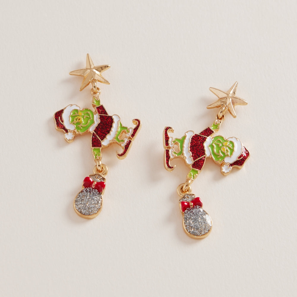 These fun post earrings show a glitter green monster mid-heist with a bright star, perfect for adding a touch of humor to festive outfits.