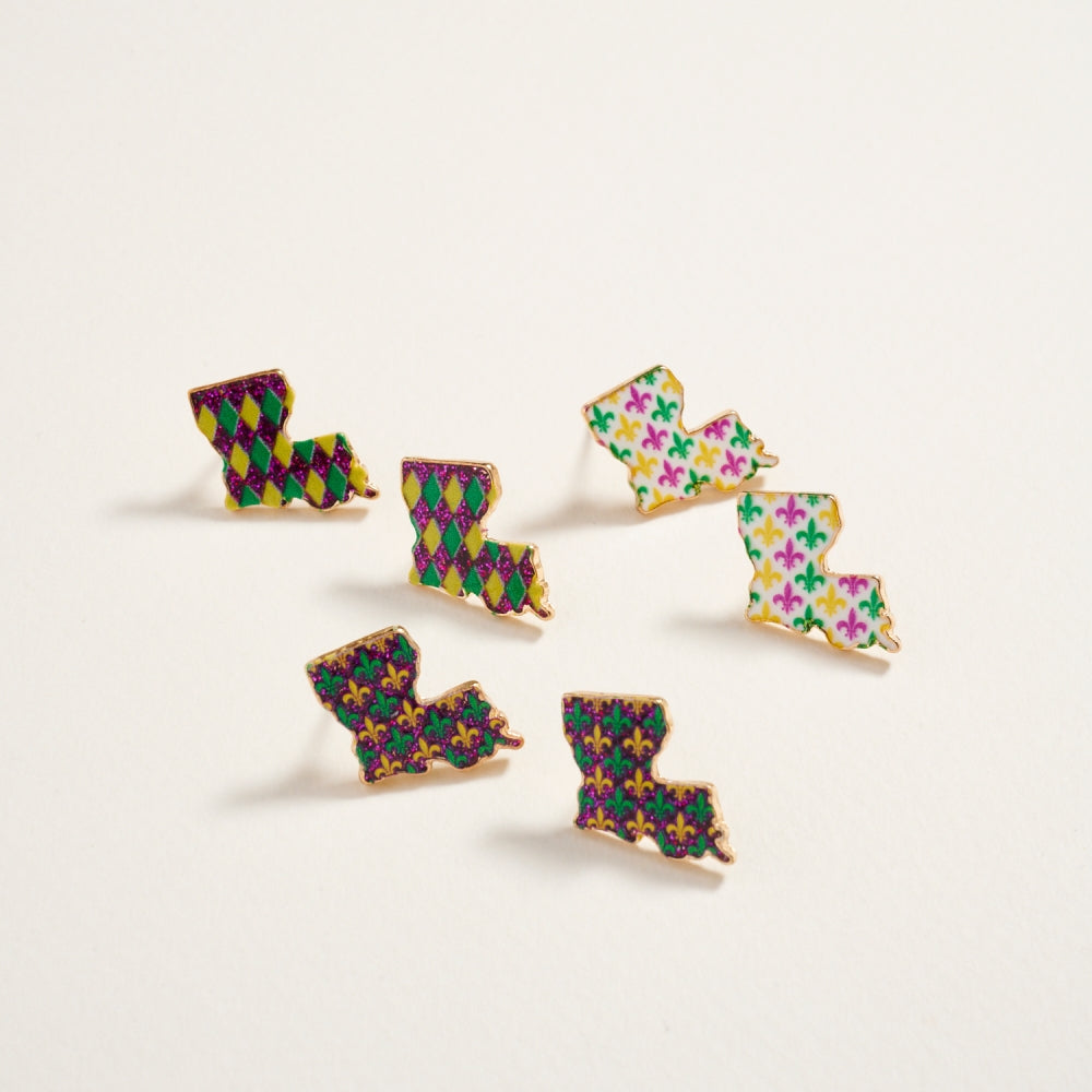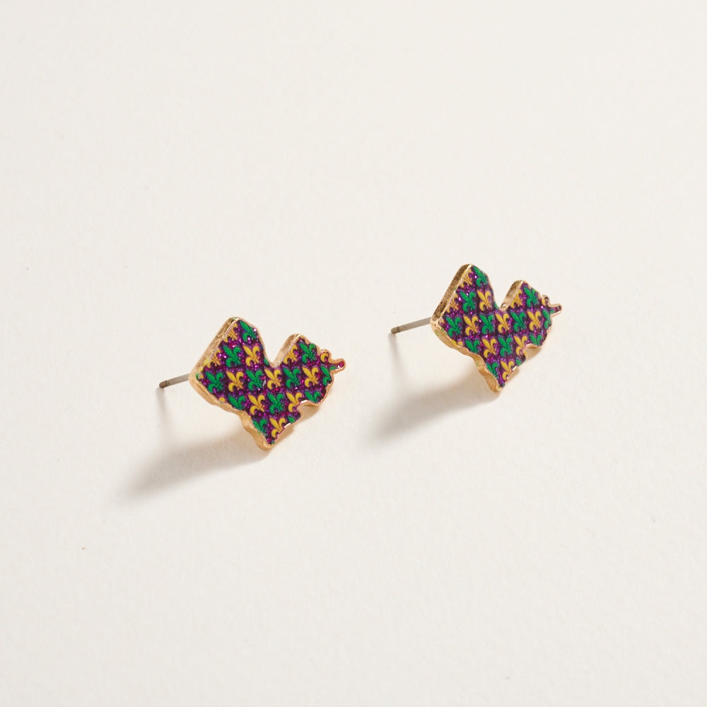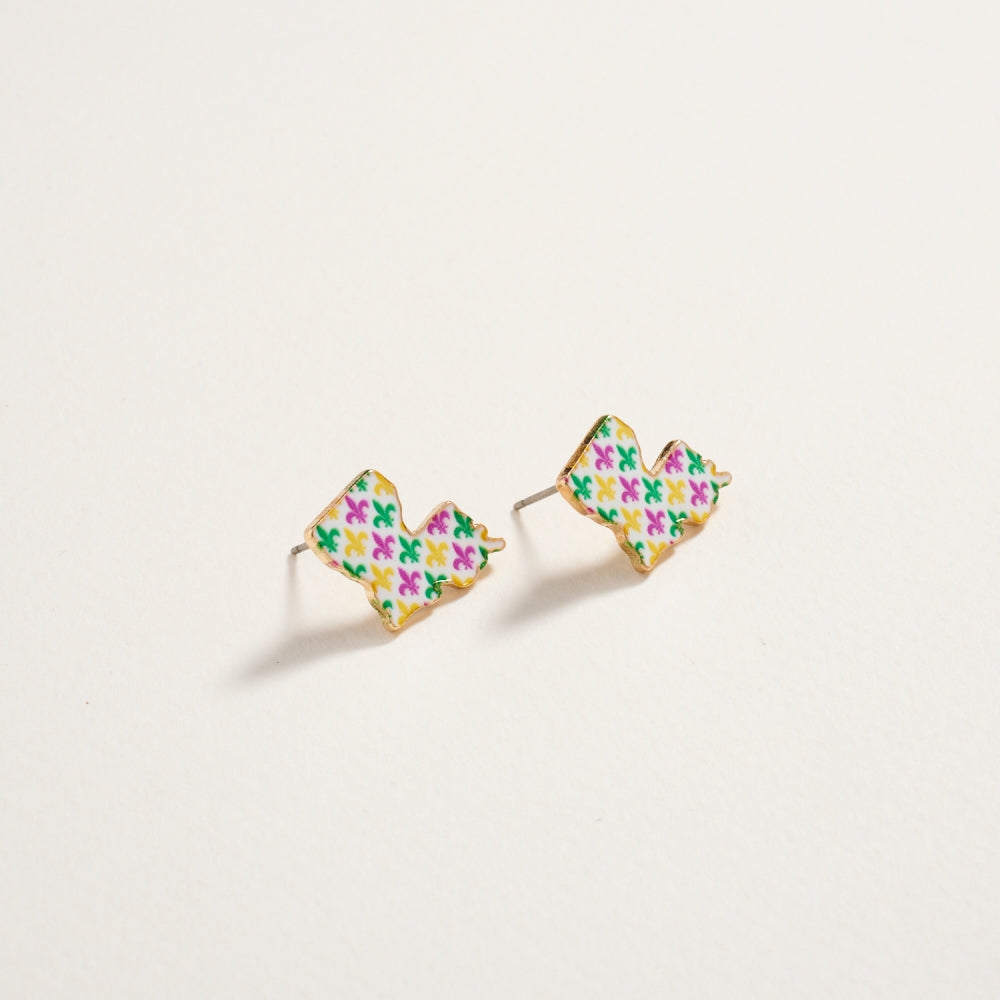 Show off your Louisiana love with these eye-catching post earrings. Designed in the shape of the state and finished with vibrant pattern prints and glitter accents, they're the perfect conversation starter for any celebration.