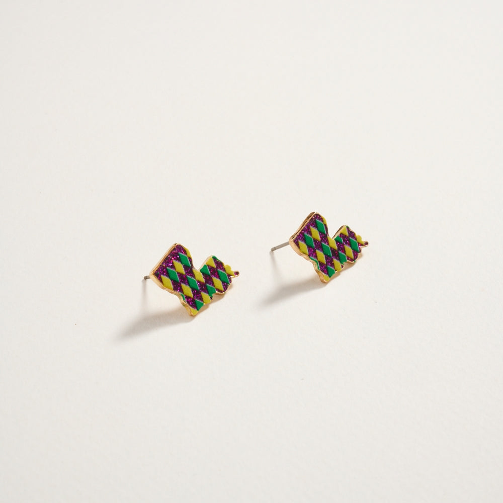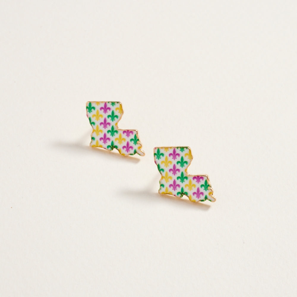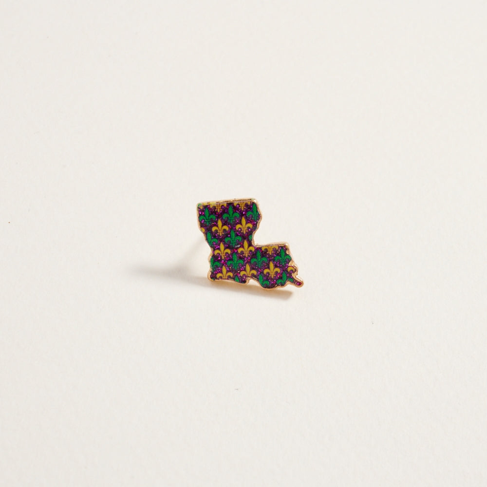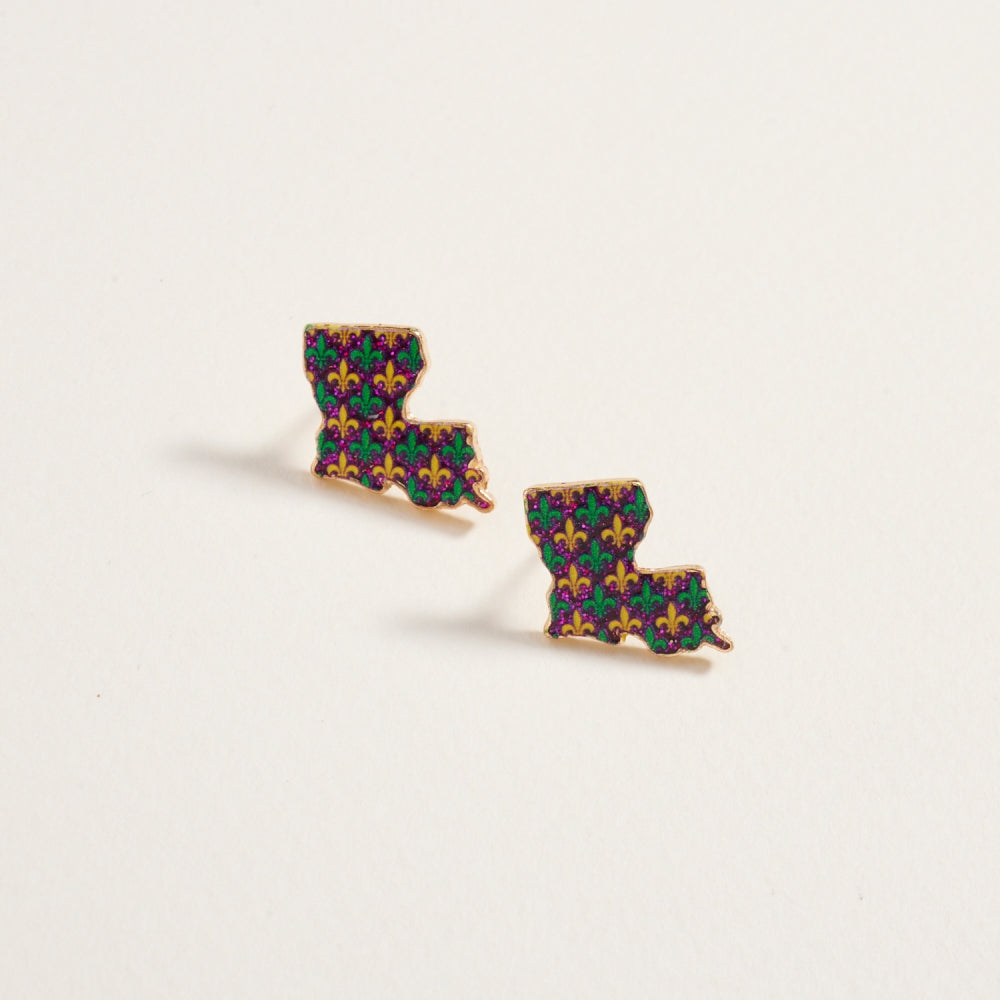 Show off your Louisiana love with these eye-catching post earrings. Designed in the shape of the state and finished with vibrant pattern prints and glitter accents, they're the perfect conversation starter for any celebration.