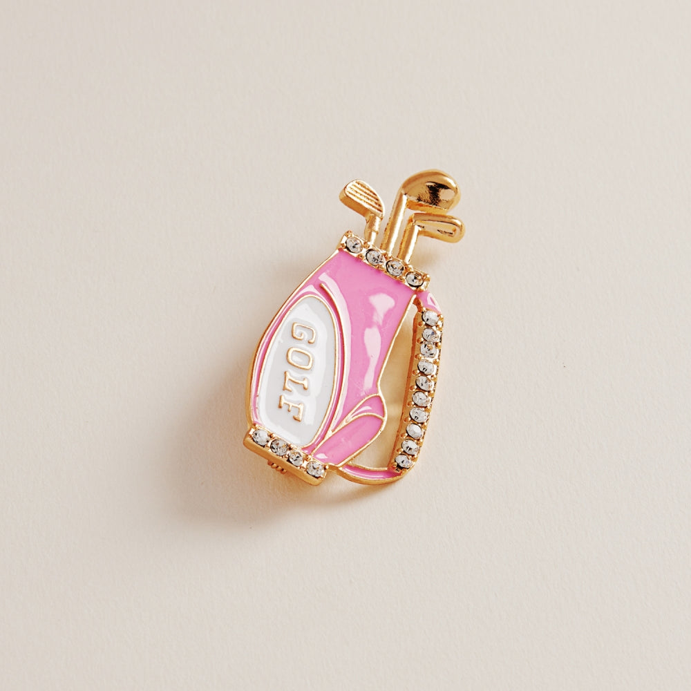 This golf bag enamel brooch features sparkling rhinestones and a sporty charm. Perfect for golf lovers, it adds personality and shine to jackets, hats, or bags.