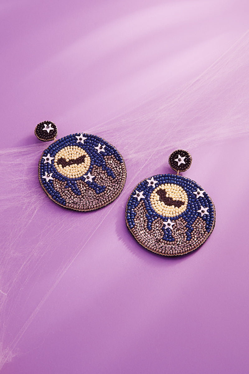 These 3 inch Halloween themed post earrings are handcrafted with Indian beads, shaped into a scary night scene. Perfect for adding a touch of spooky style to your outfit. Expertly made and measuring at 3 inches, these earrings are sure to make a statement.