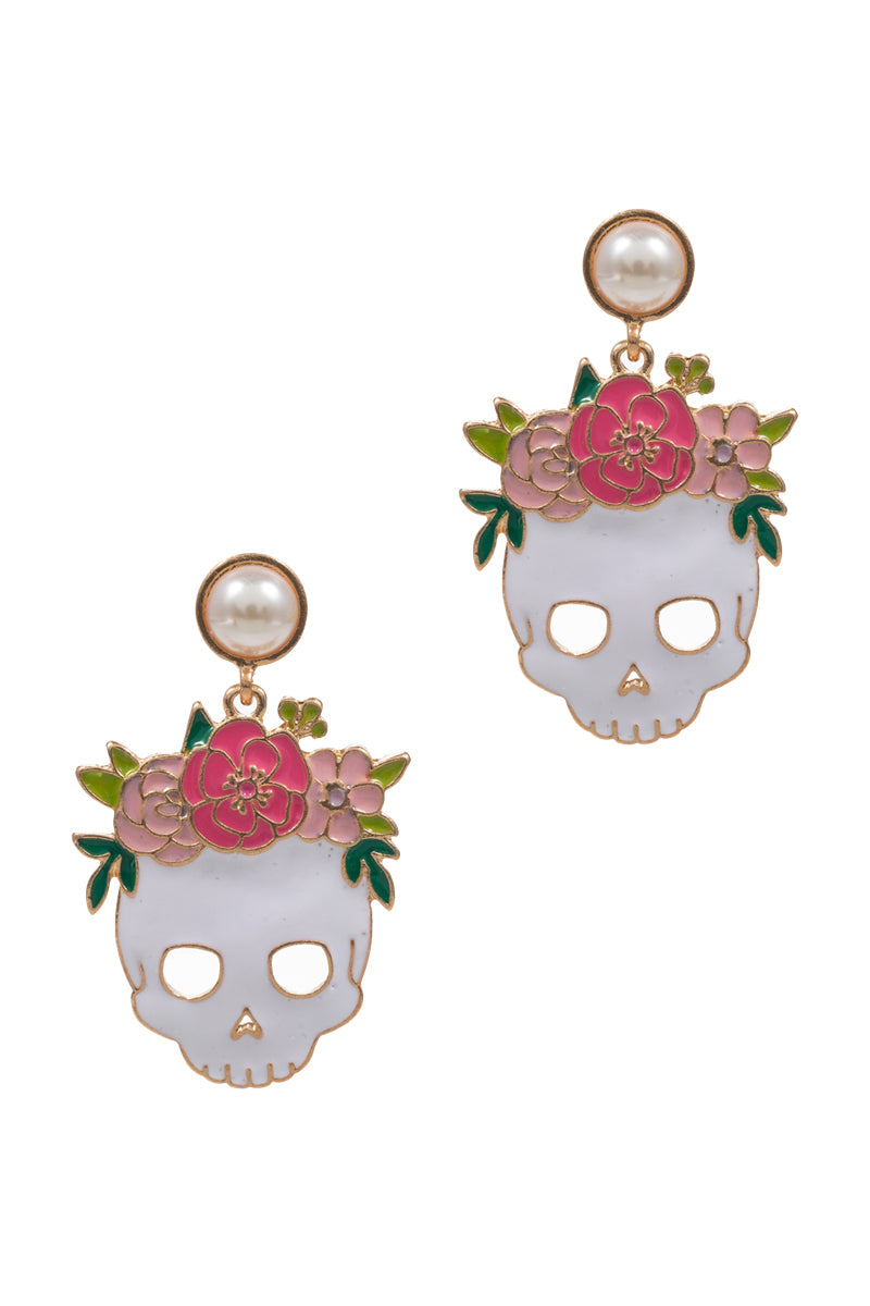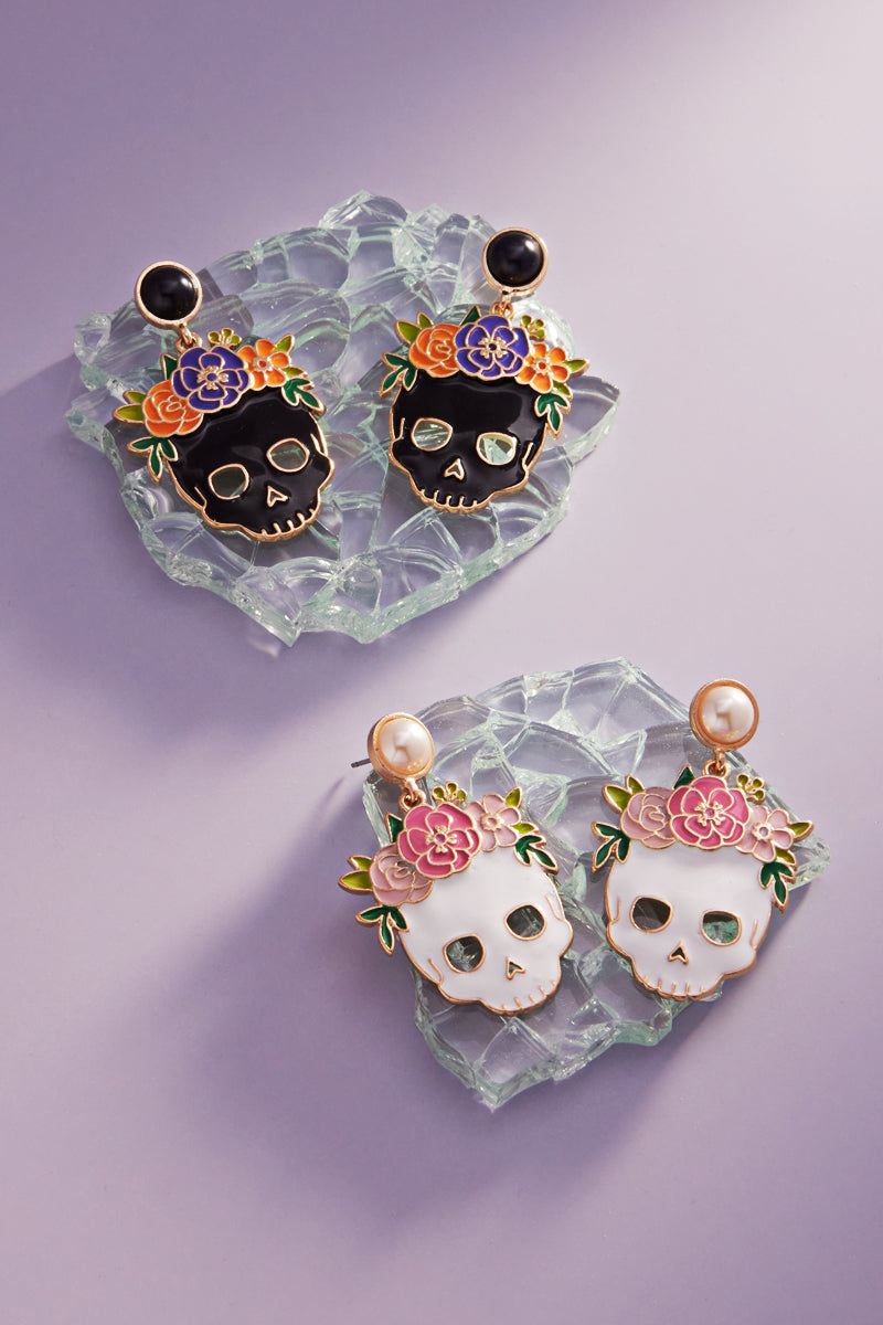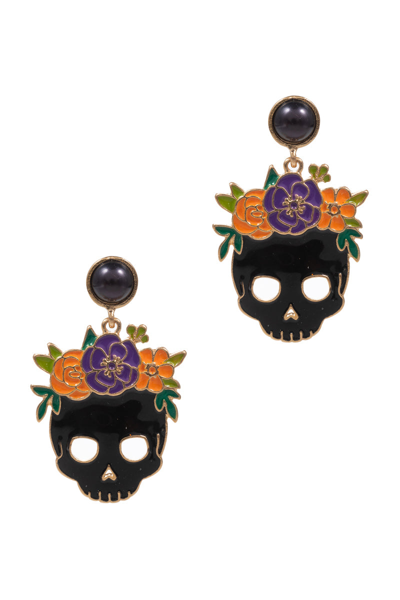 Create a bold statement with these unique earrings that feature a realistic skull design and intricate floral detailing. Made with high-quality materials, these earrings are perfect for adding an edgy touch to any outfit.