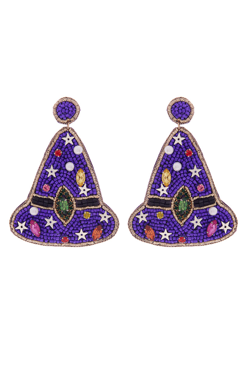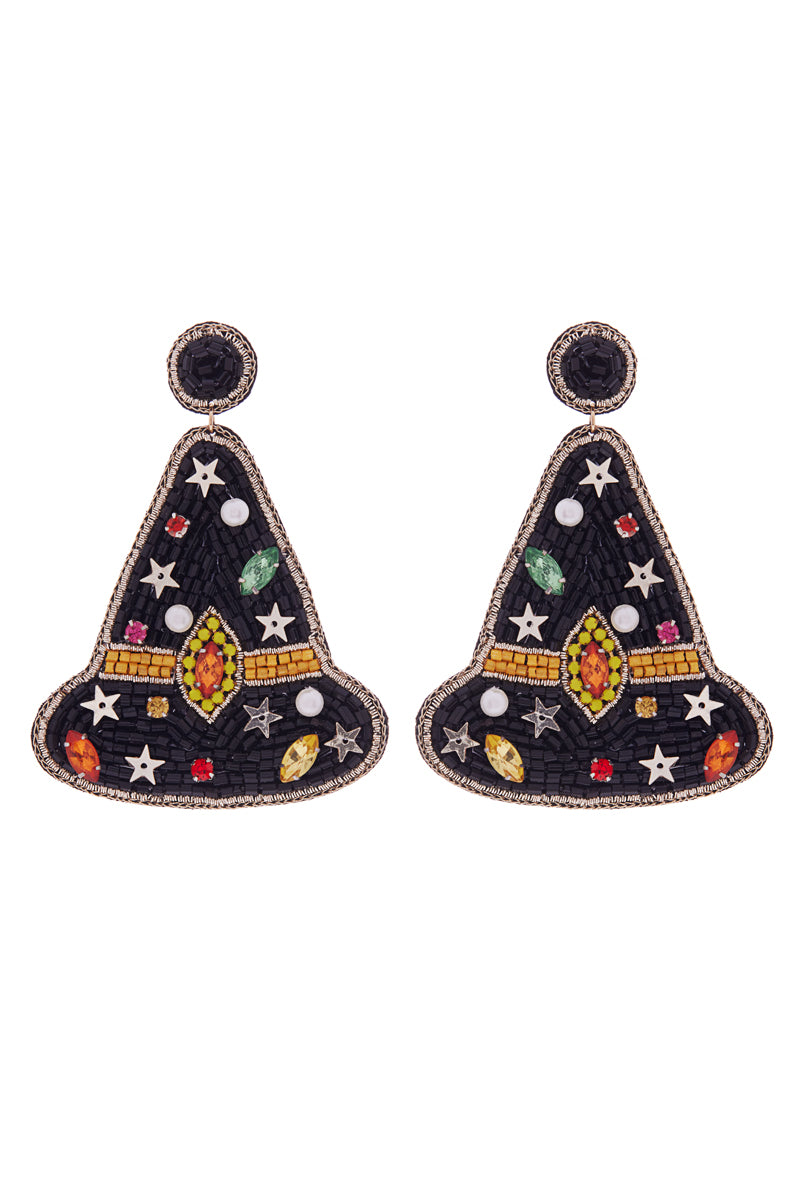 Expertly crafted and uniquely designed, these 3-inch witch hat night shaped earrings feature handcrafted Indian beads for a touch of traditional elegance. Make a statement with these one-of-a-kind accessories that showcase your style and attention to detail.